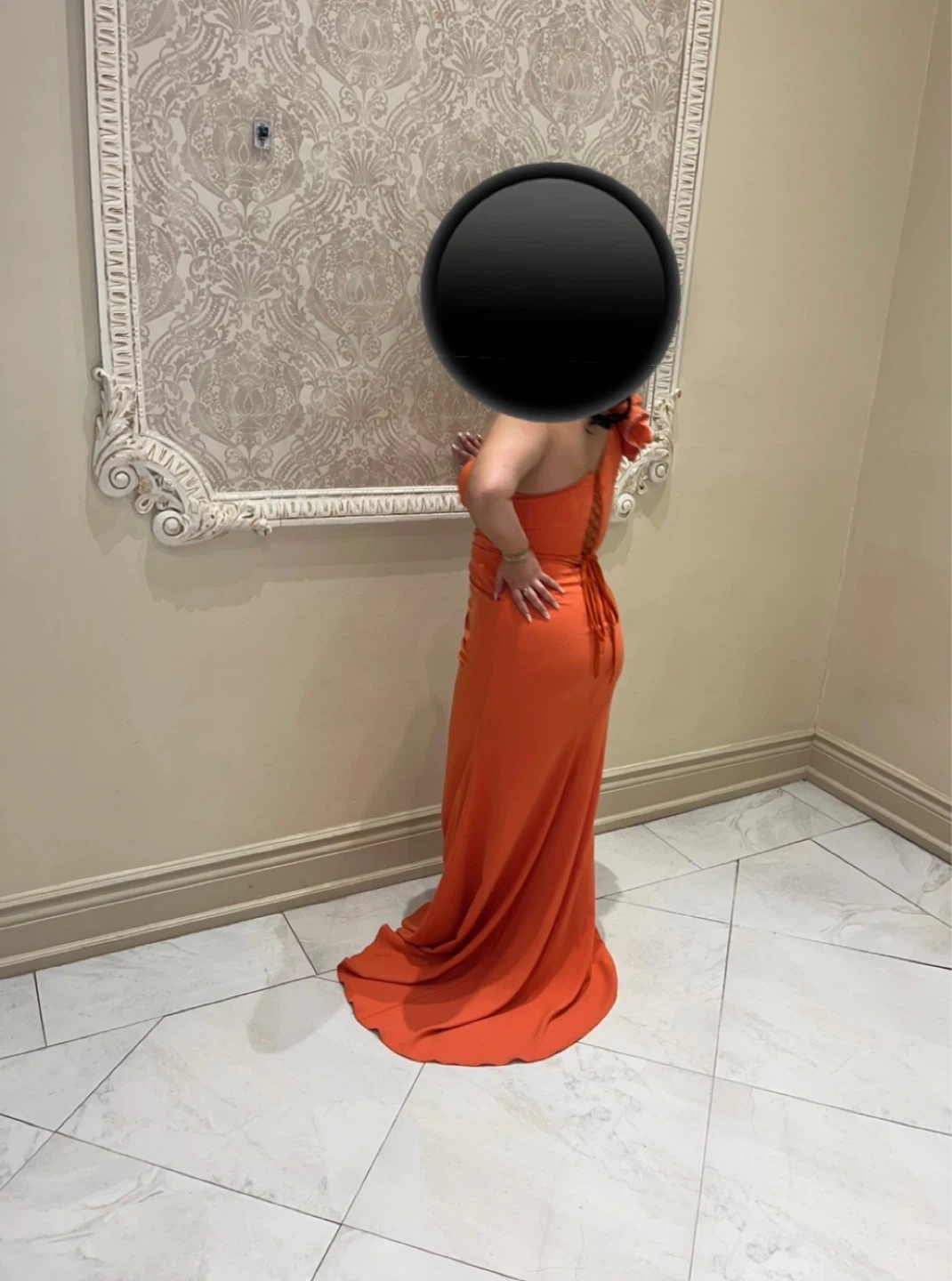 Striking orange gown with a one-shoulder design and dramatic ruffled accent on the shoulder.