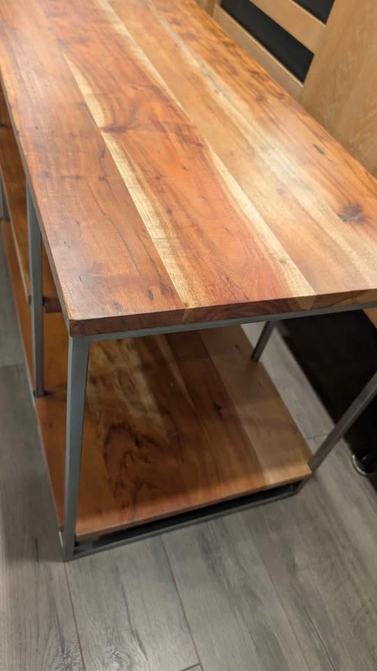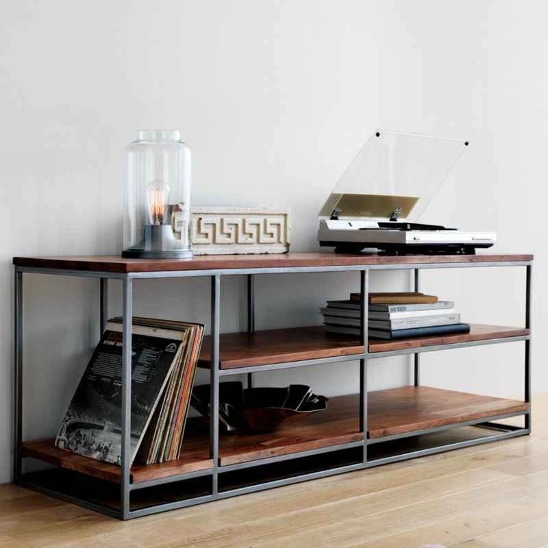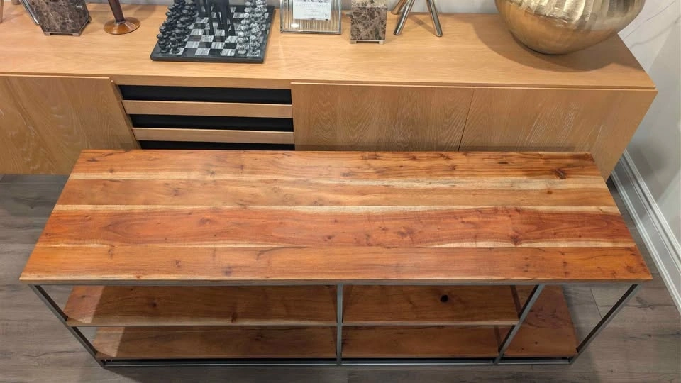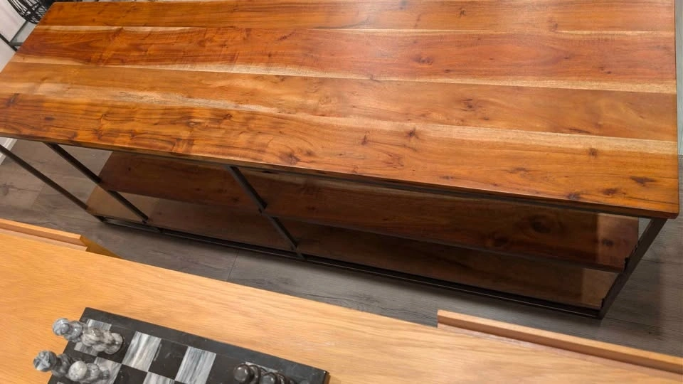 Nature channel. Architectural three-tier structure entertains in the raw. Braced by a sleek iron frame, wide planks of solid sustainable acacia wood show beautiful light-to-dark tones, active grain and naturally occurring knots.