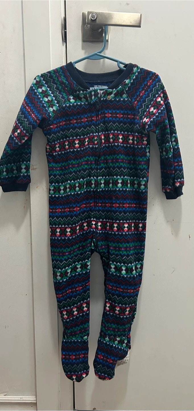 Cozy fleece footed pajamas with a festive fair isle pattern. Features a zip-up front for easy dressing. Made of soft polyester material.
