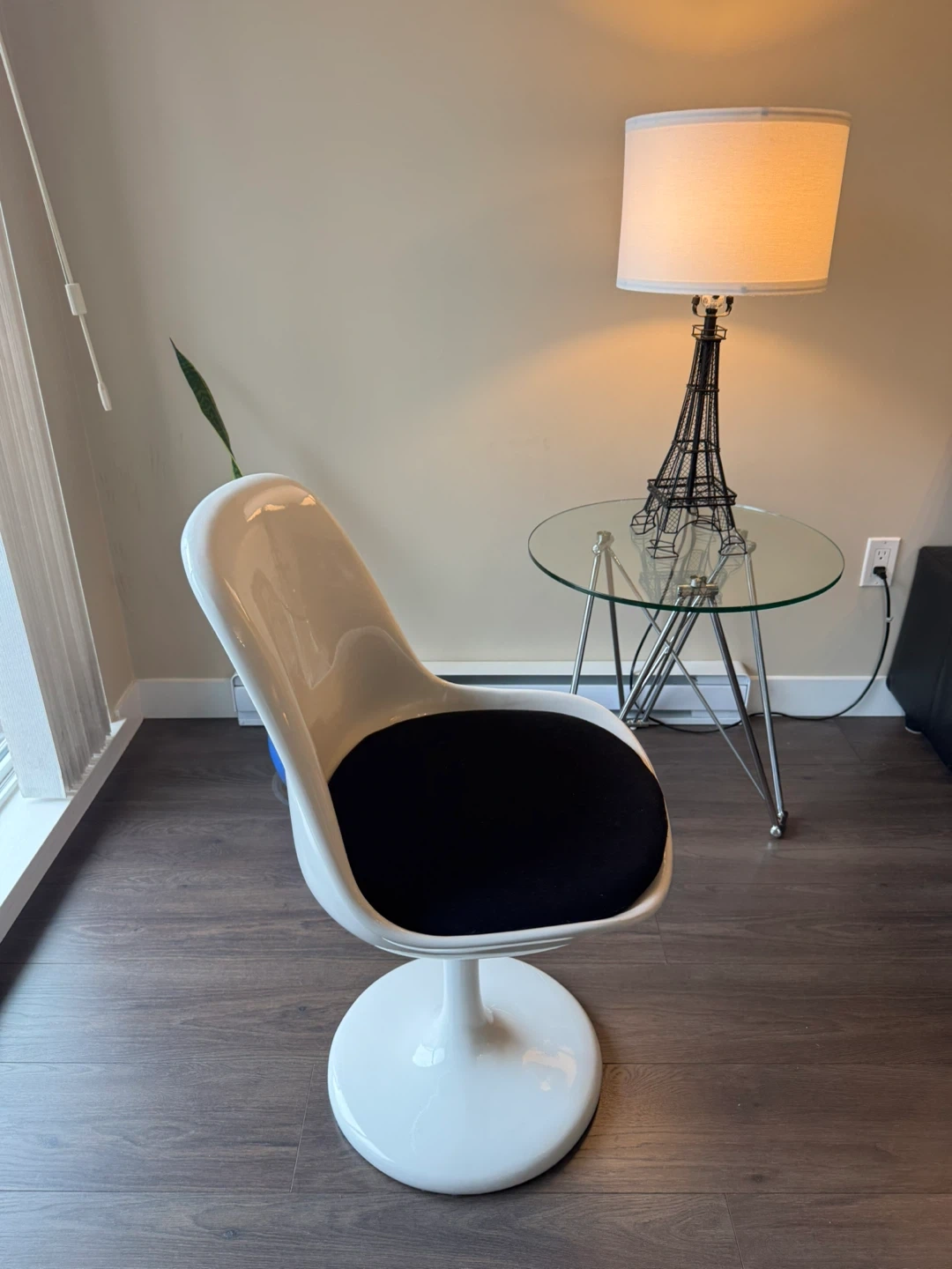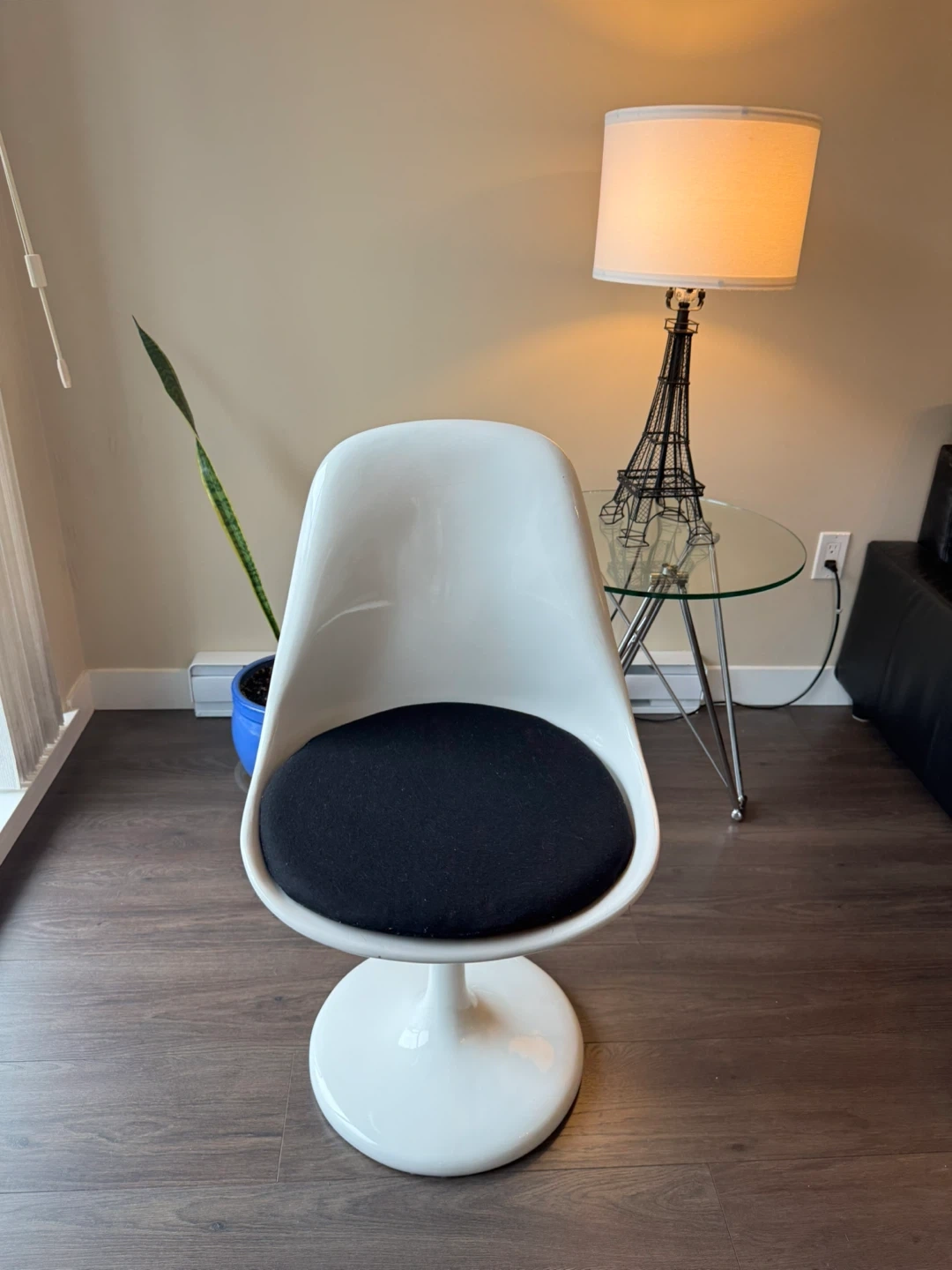 Beautiful tulip-style chair inspired by the iconic mid-century design. White fiberglass shell with a black seat cushion and pedestal base.
