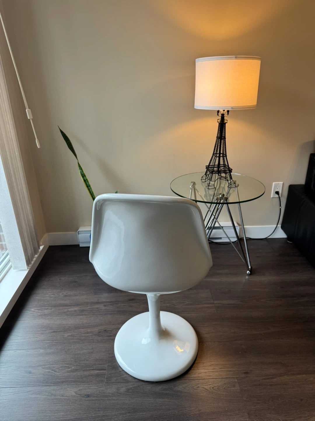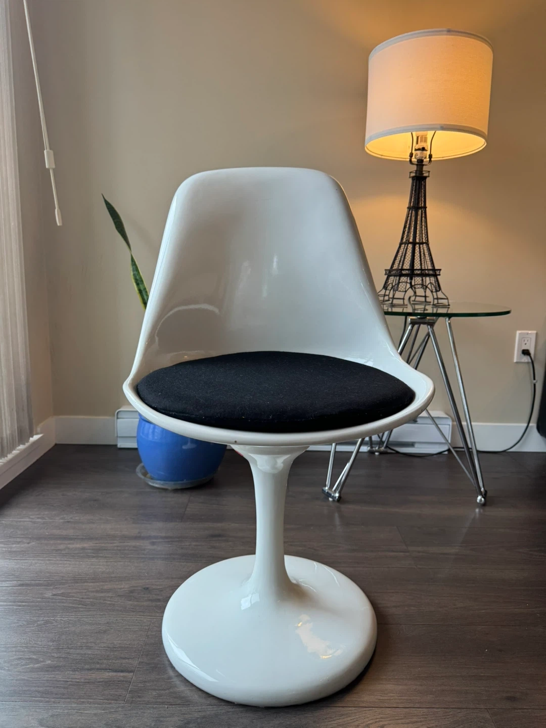Beautiful tulip-style chair inspired by the iconic mid-century design. White fiberglass shell with a black seat cushion and pedestal base.