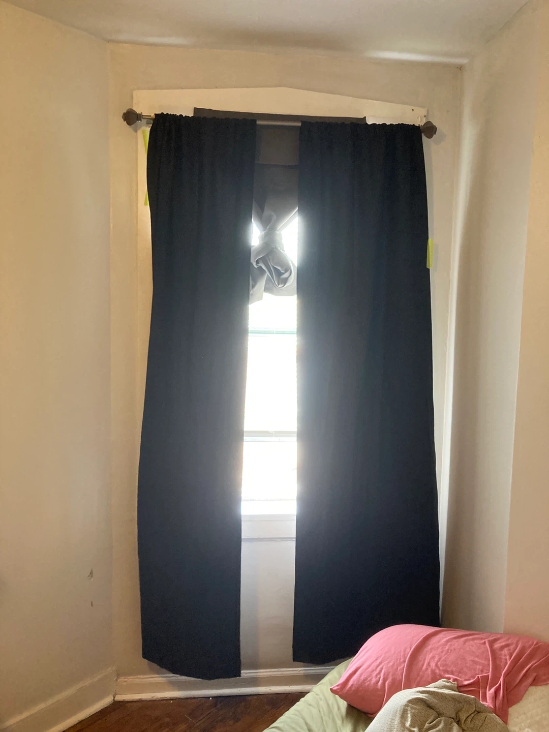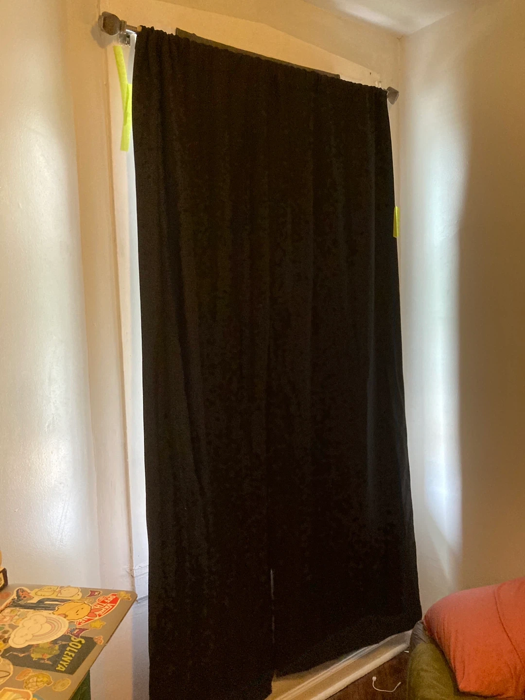 Two black blackout curtains. They're a dark solid color and hang on a curtain rod. These are great for blocking out light! Rod included what a deal Lol
