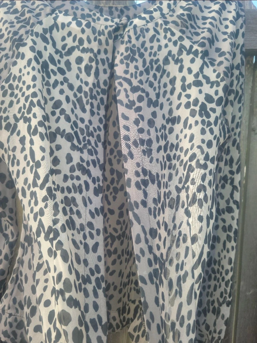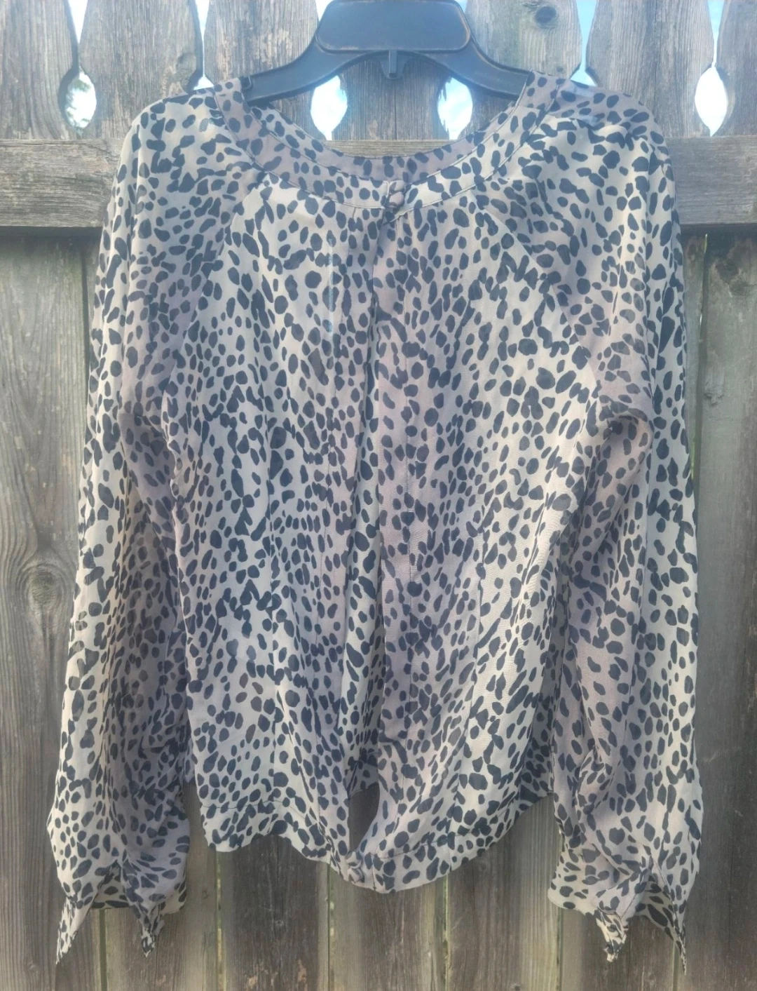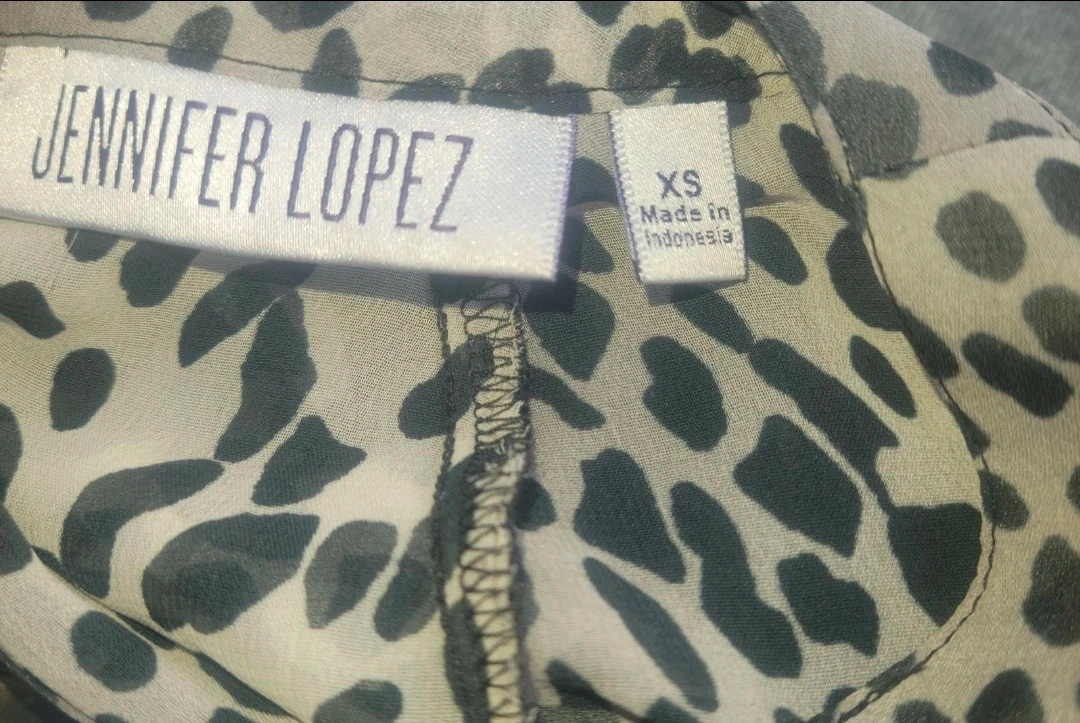 Jennifer Lopez women's long sleeve blouse. Features an all-over animal print design. Size XS. Made in Indonesia. Sheer fabric with button cuff sleeves. Top is a lightweight material.