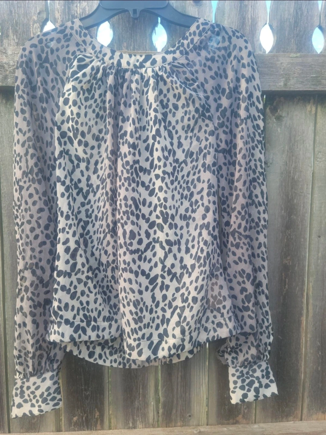 Jennifer Lopez women's long sleeve blouse. Features an all-over animal print design. Size XS. Made in Indonesia. Sheer fabric with button cuff sleeves. Top is a lightweight material.