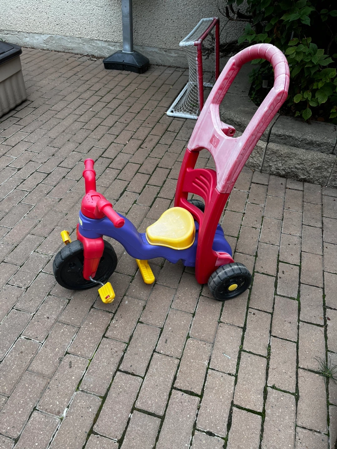 Selling a used kids tricycle. It's in good condition for some outdoor fun! The tricycle features a handle for easy pushing and steering, perfect for little ones learning to ride. There’s a built-in footrest or pedals depending on your little one’s skill level and the seat can be adjusted to be closer or further from the handlebar. It has a vibrant colour scheme with red, blue, and yellow parts.