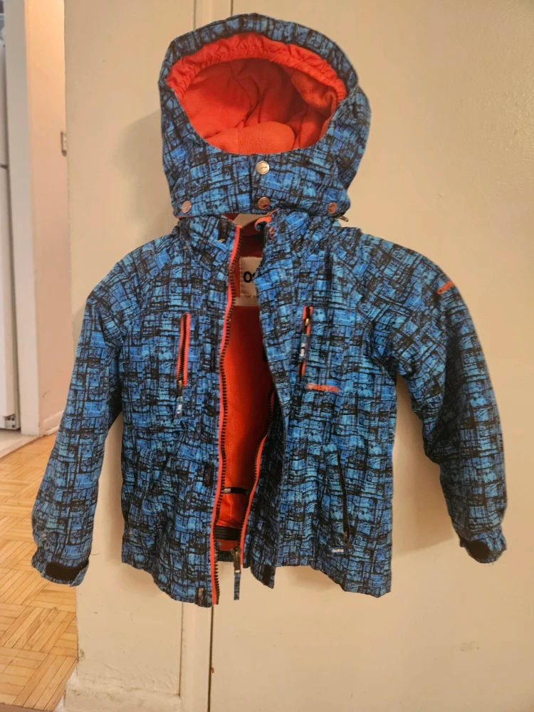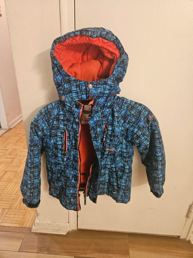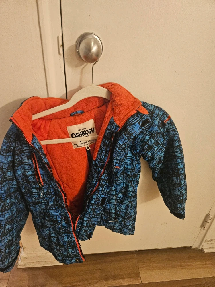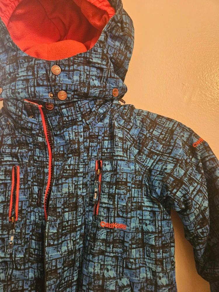 Selling a cute OshKosh winter jacket for kids! It's a size 6 and features a stylish blue and black pattern with a cozy orange fleece lining. Perfect for keeping your little one warm during the colder months!