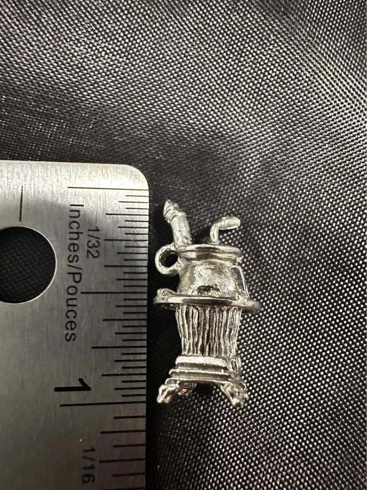 Cute sterling silver miniature stove charm. Has 'STER' mark on side. Measures about 1 inch tall. Great for collectors or as a unique gift. Pickup only in Coquitlam, Westwood Plateau, behind IGA.