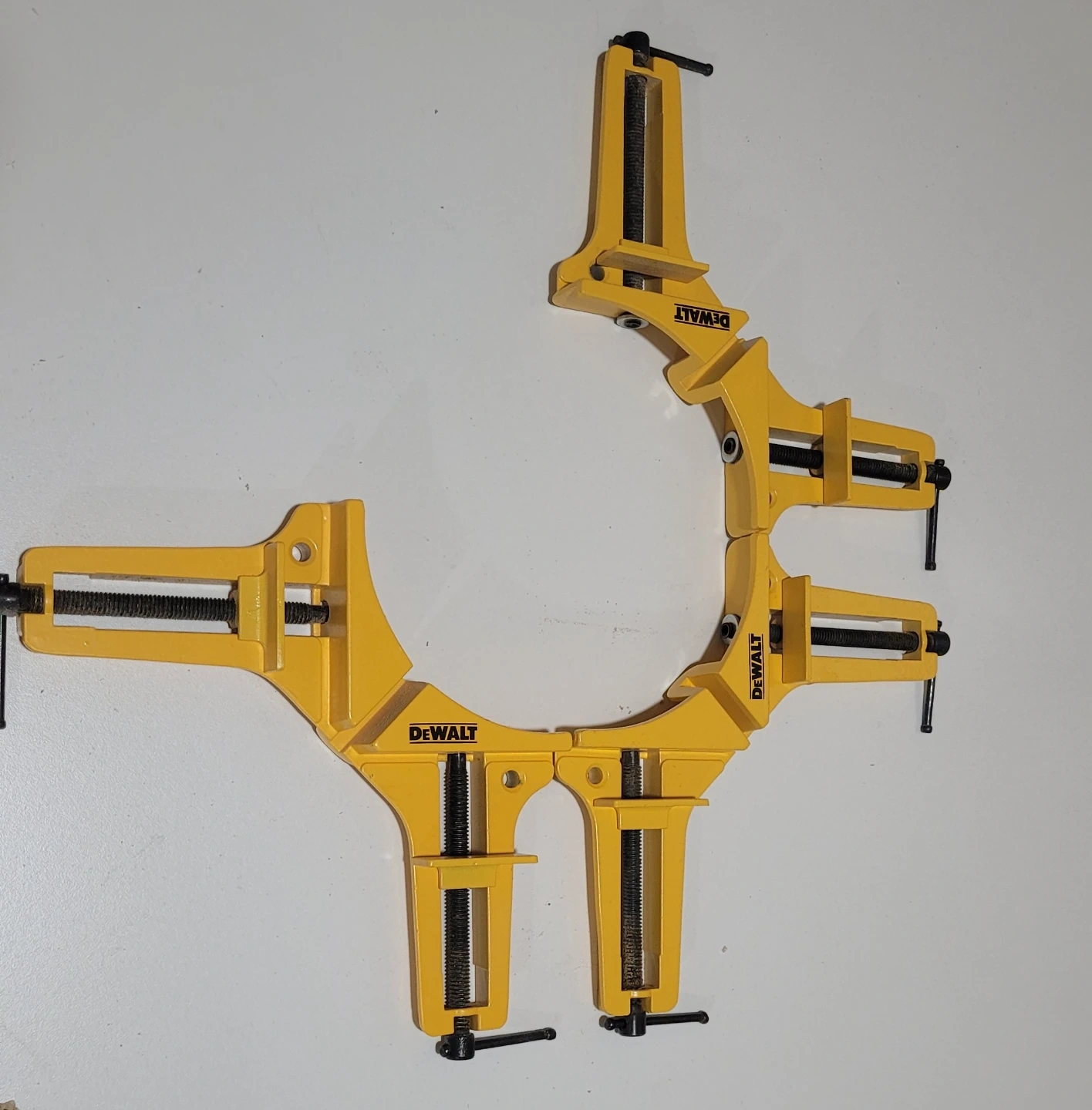 This set includes 3 DeWalt yellow 90-degree corner clamps. They're made of durable metal. These clamps help ensure accurate right-angle corners when you're building or repairing projects. Perfect for woodworking and framing!