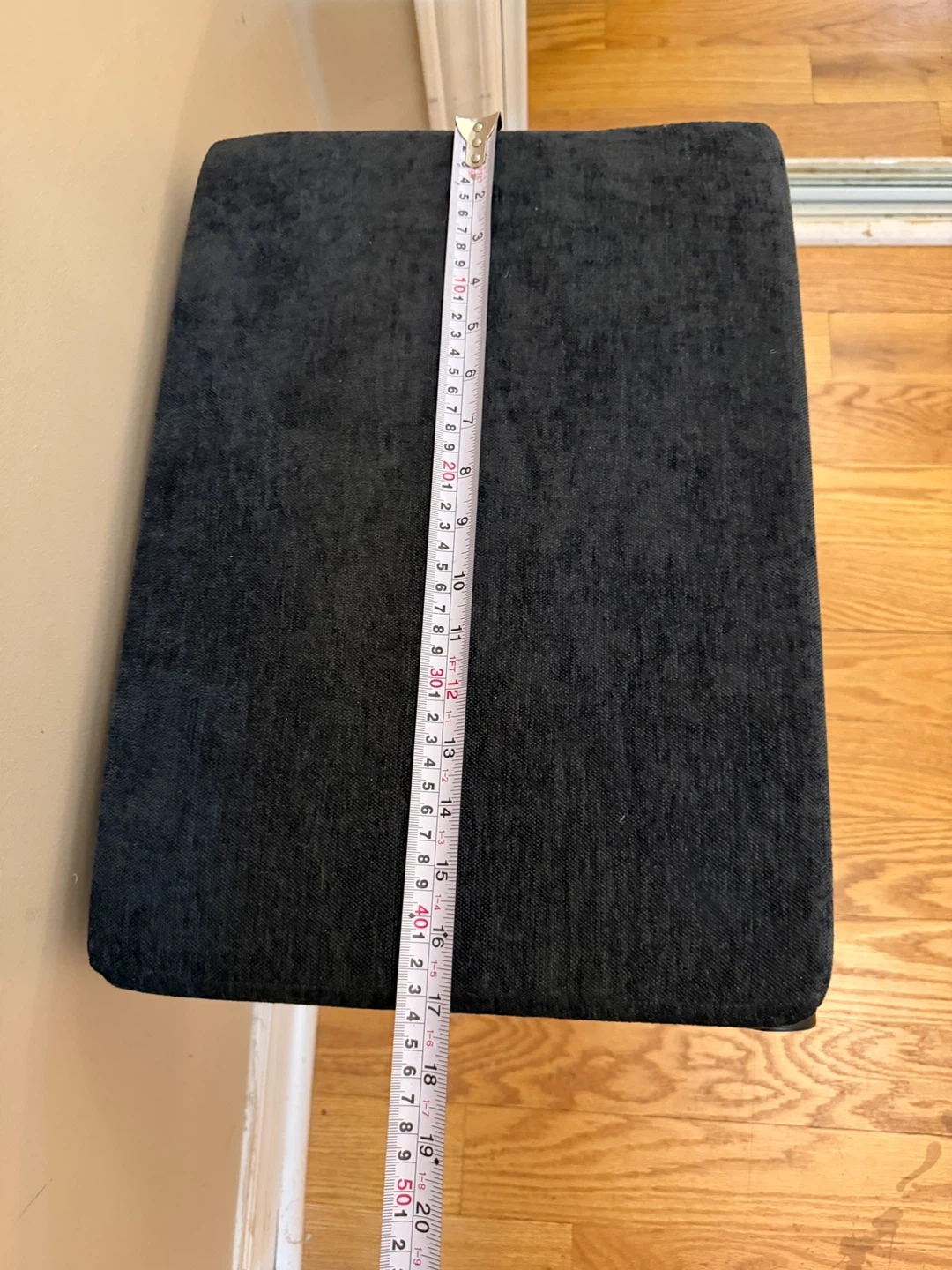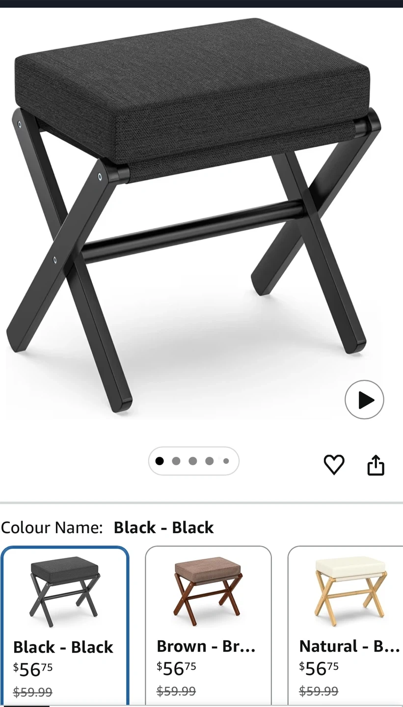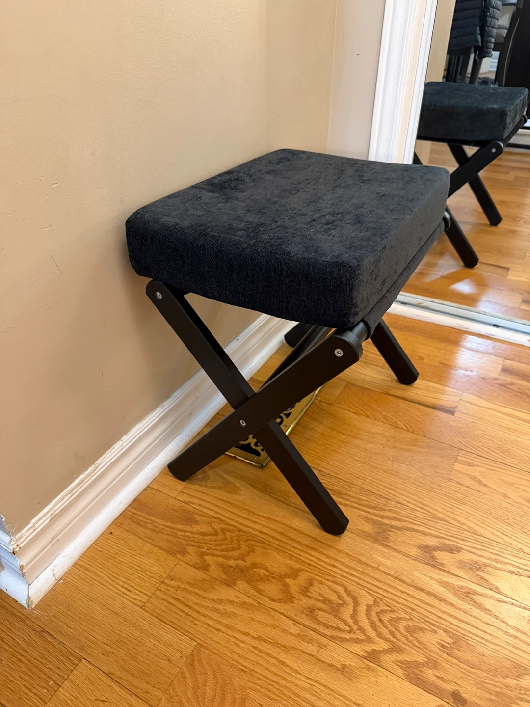 This is a black upholstered folding stool. It's a compact size, perfect for a vanity or extra seating. The frame is black wood and the upholstery is fabric.