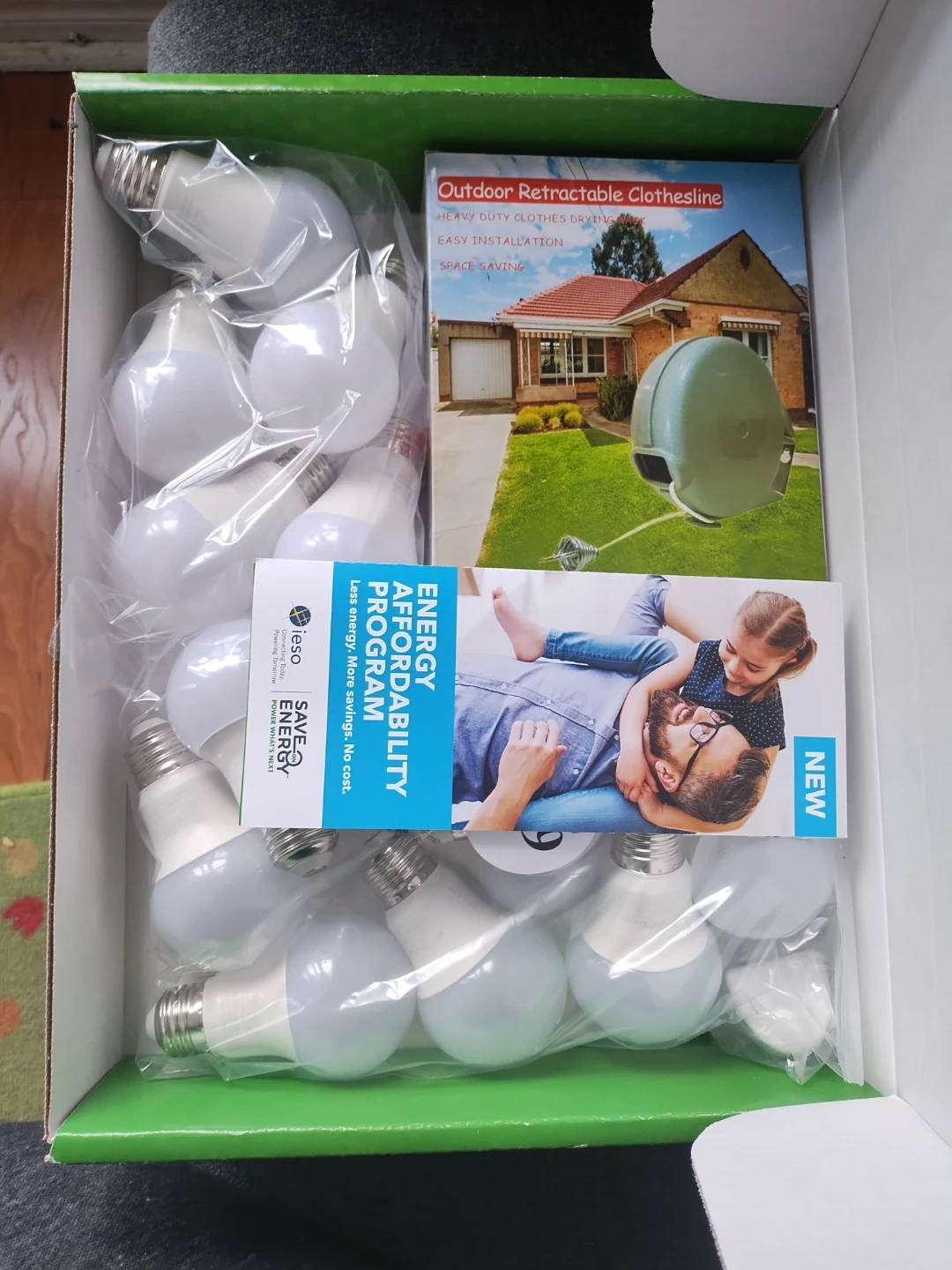 This kit includes multiple LED light bulbs for energy efficiency and an outdoor retractable clothesline. It's part of the Energy Affordability Program. Less energy, more savings!