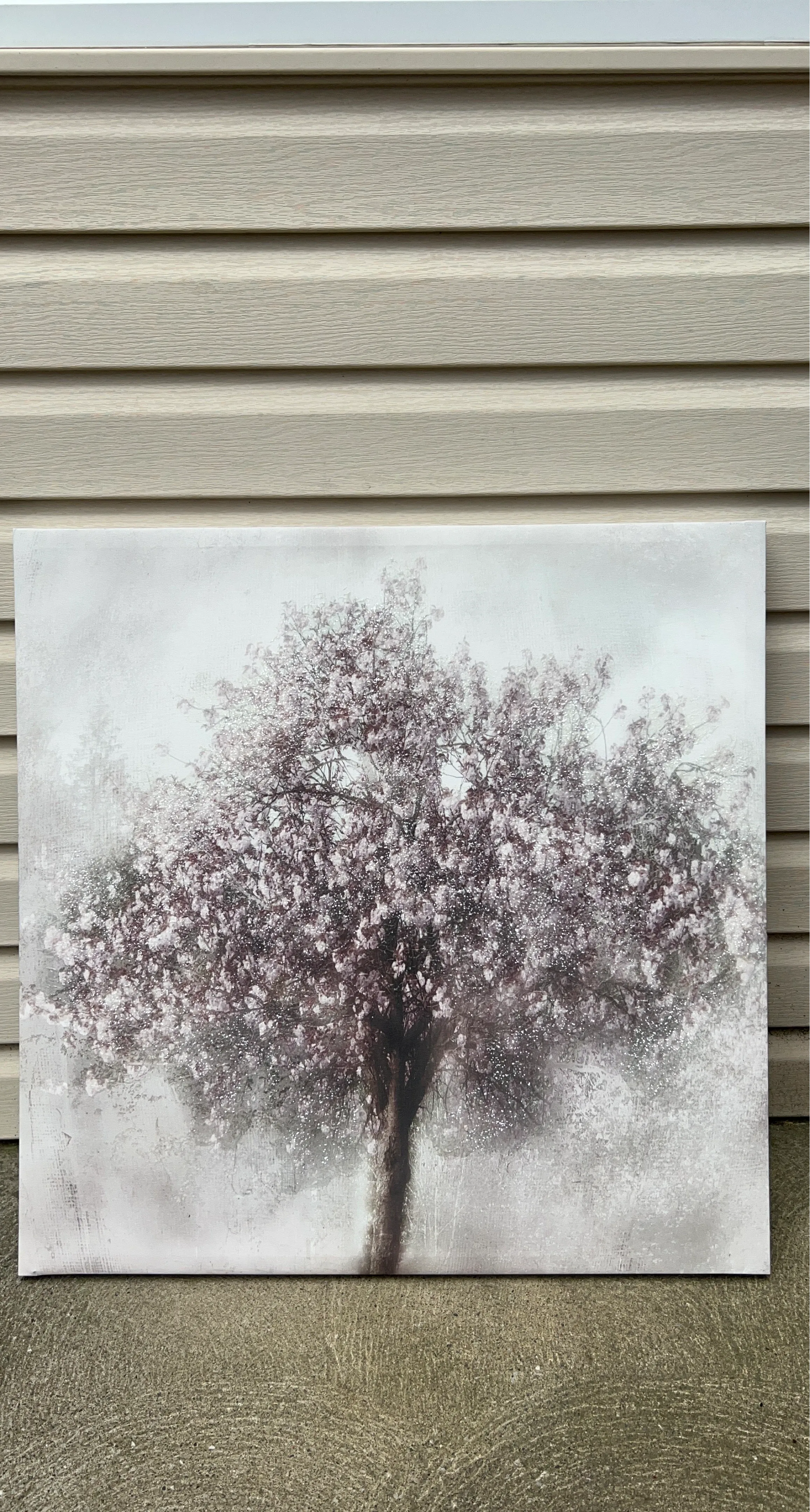 This is a canvas print featuring a blooming tree in soft, misty tones with sparkles. It's a landscape piece suitable for home decor. The print is stretched on a canvas frame.