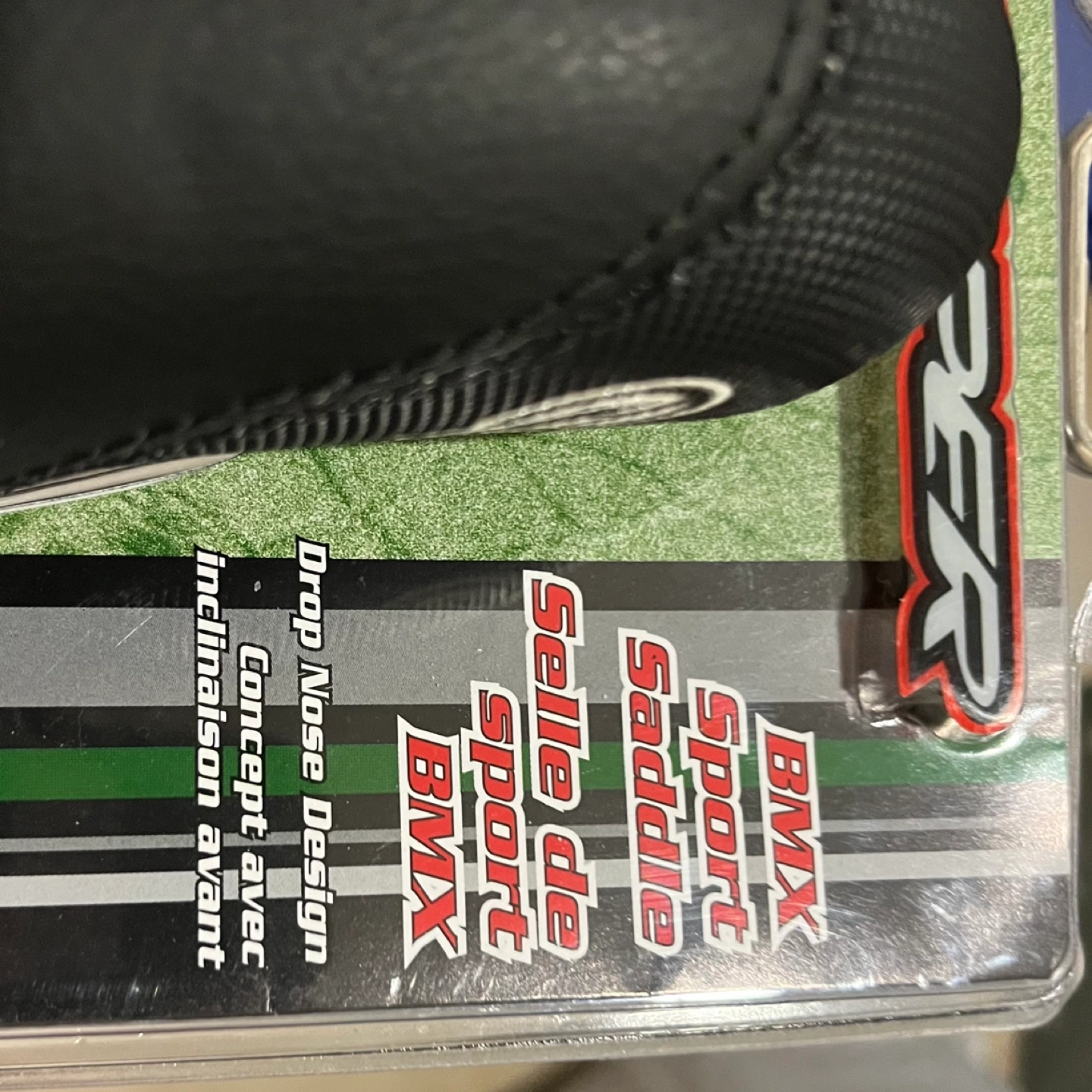New, never used BMX bike seat. Black colour. Drop nose design. Includes mounting hardware. Packaged in original plastic.