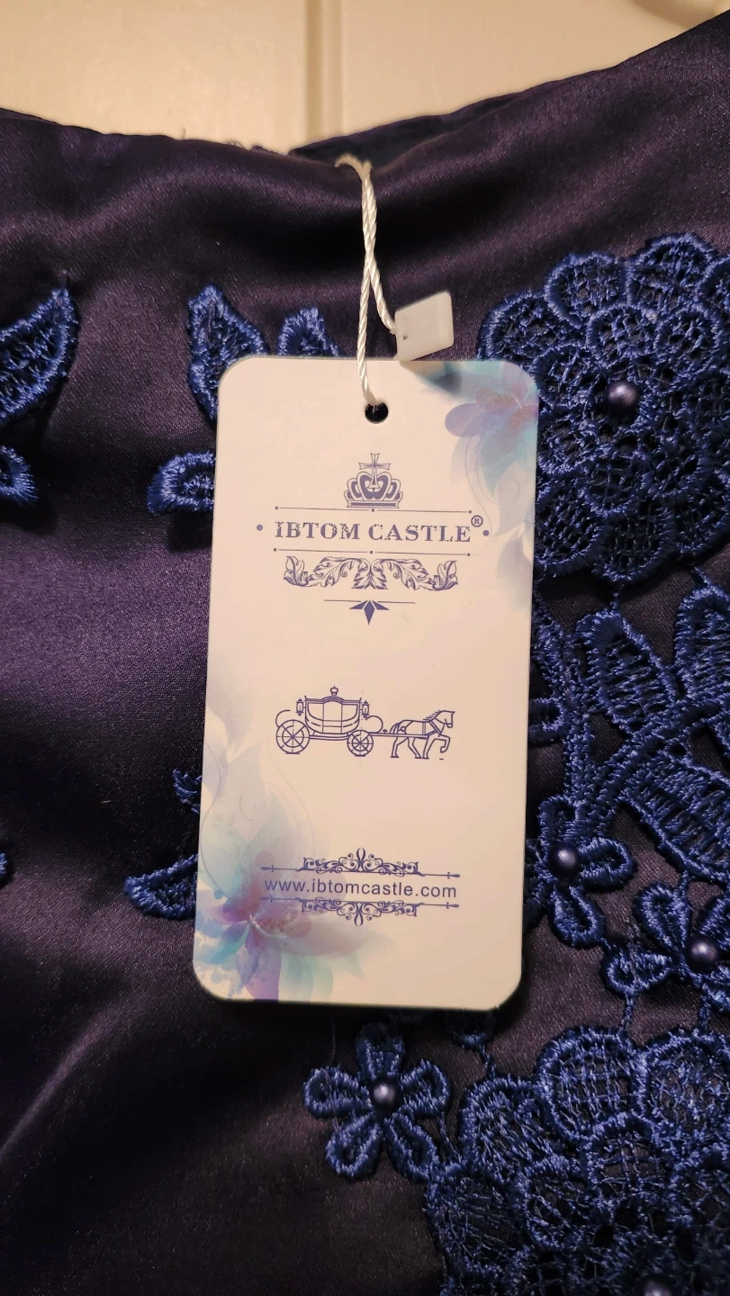 Beautiful navy blue dress from Ibtom Castle. It features intricate blue lace detailing on the bodice and sleeves. Perfect for a special occasion!