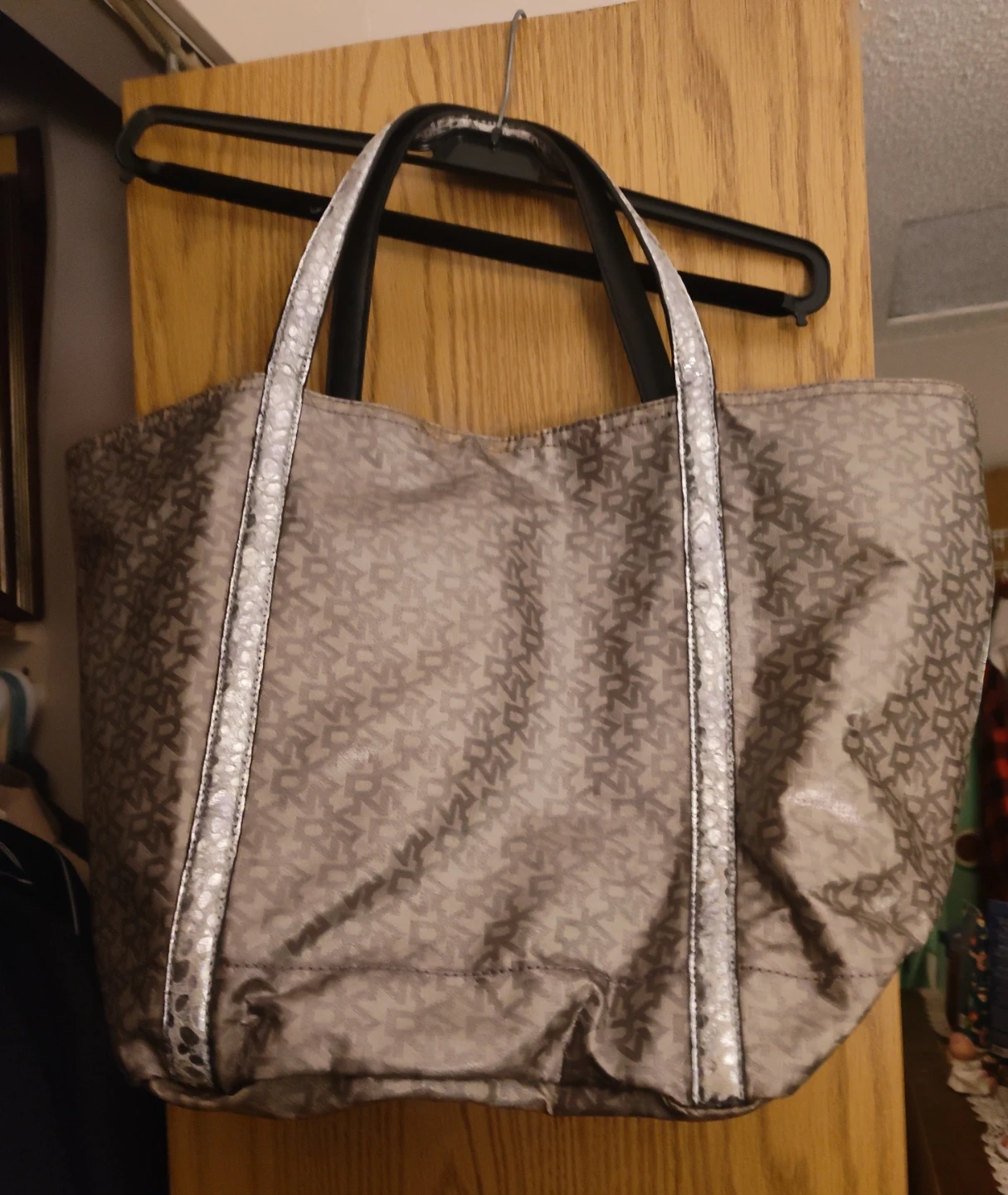 Large tote bag 20.5 inches across, 13.5 tall(not including handles), bottom 11 inches W, opening 17 inches W. Three storage sleeves/ pockets inside one that is zippered. NS, small dog home. PU 216th & Lougheed Hwy or Langley Centre on Thursday's 930-1230.