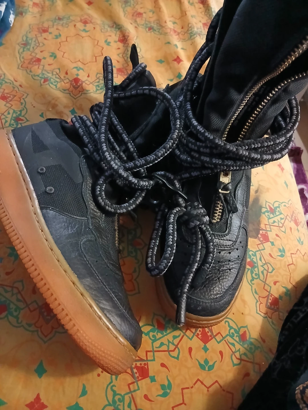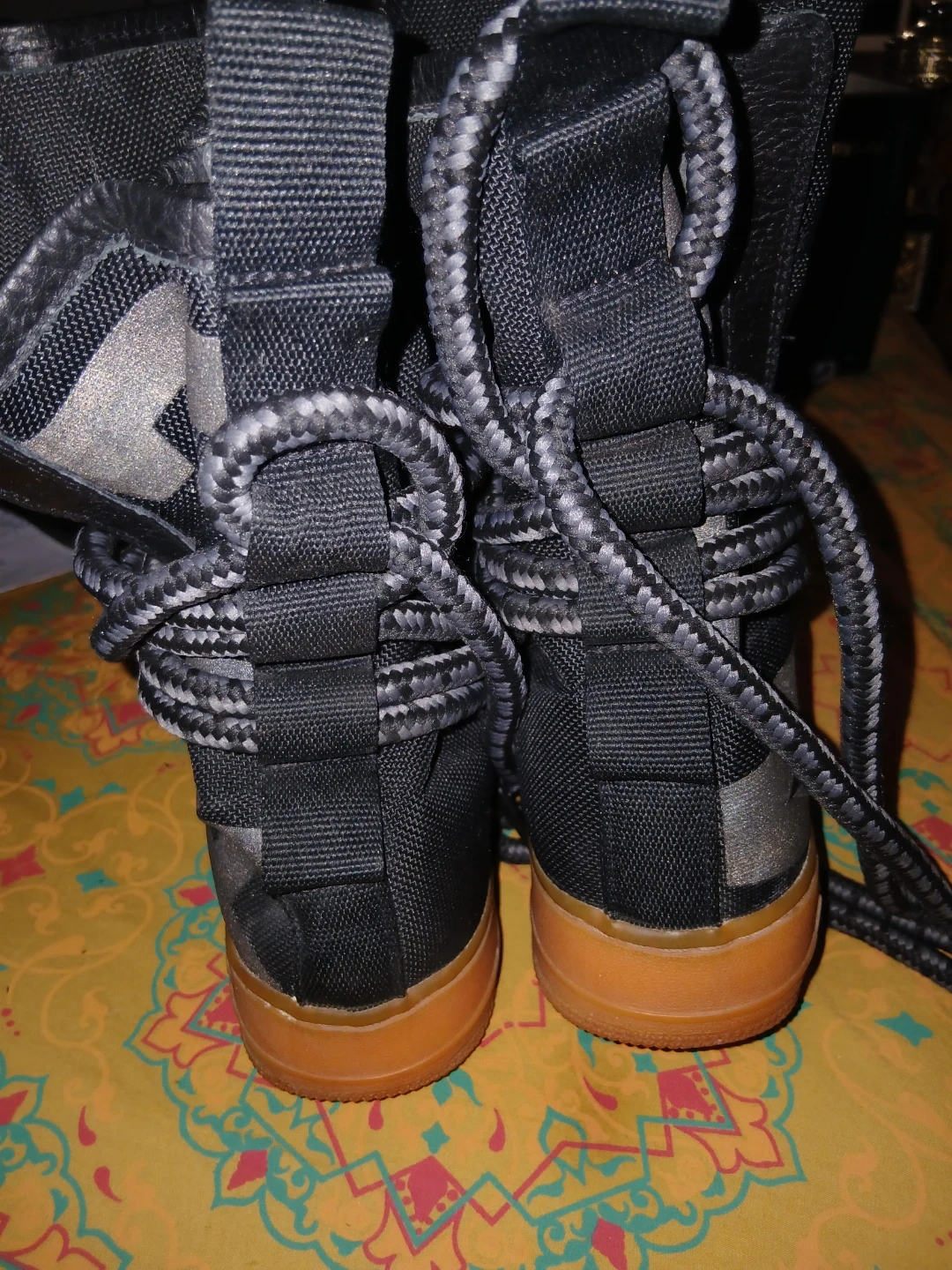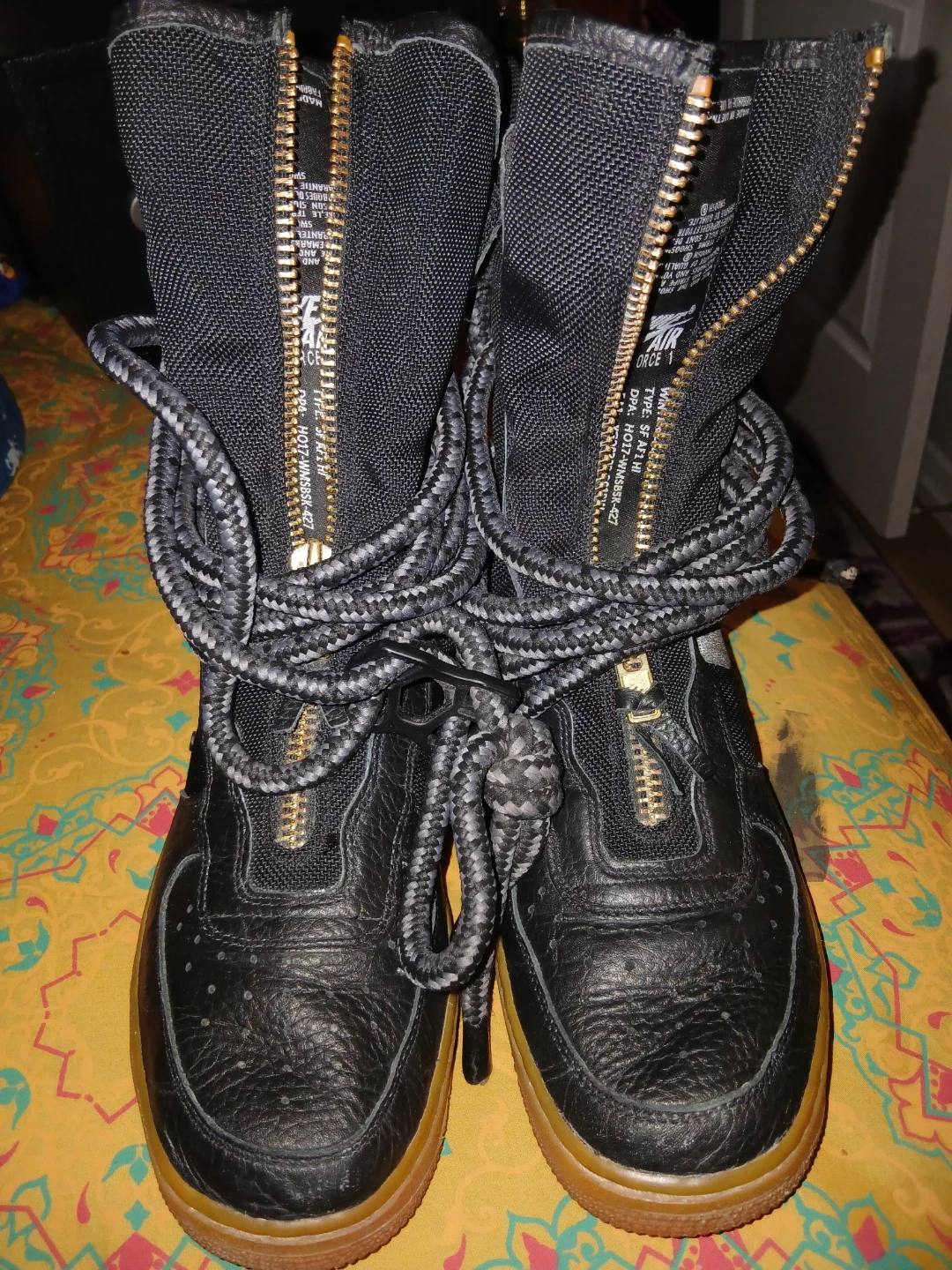 These are Nike Air Force 1 Winterized High Top Boots in black. They feature a gum sole and gold zippers. The US size is 8.5, EUR 40, UK 6, and CM 25.5.
