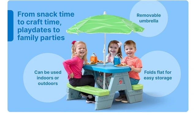 Brand New in Box! Step2 Sun & Shade Picnic Table with Umbrella, perfect for kids to enjoy indoor and outdoor activities, snack time, or even arts and crafts! Ready for kids to enjoy. Key features include: * A removable umbrella to provide shade on sunny days. * Durable construction, easy to clean and maintain. * Compact design that's great for small spaces and easy storage. While this picnic table and umbrella set are delightful, remember that if the ad is still up, it's still available! Remember to check out my other ads. Discount available for multiple purchases!