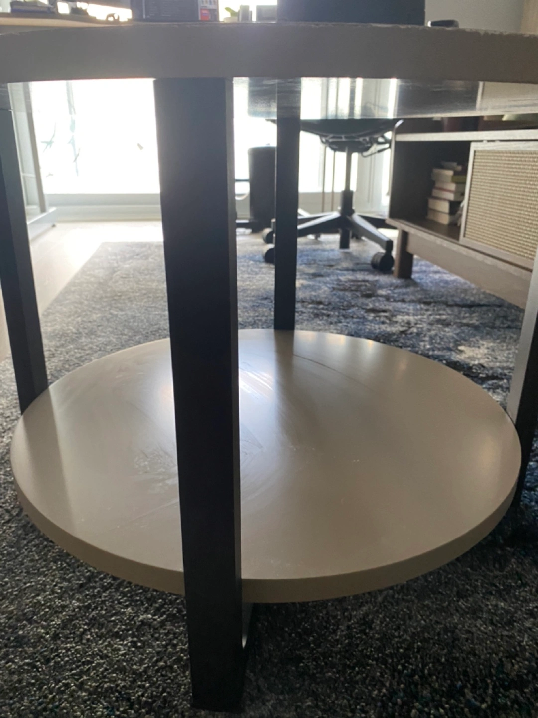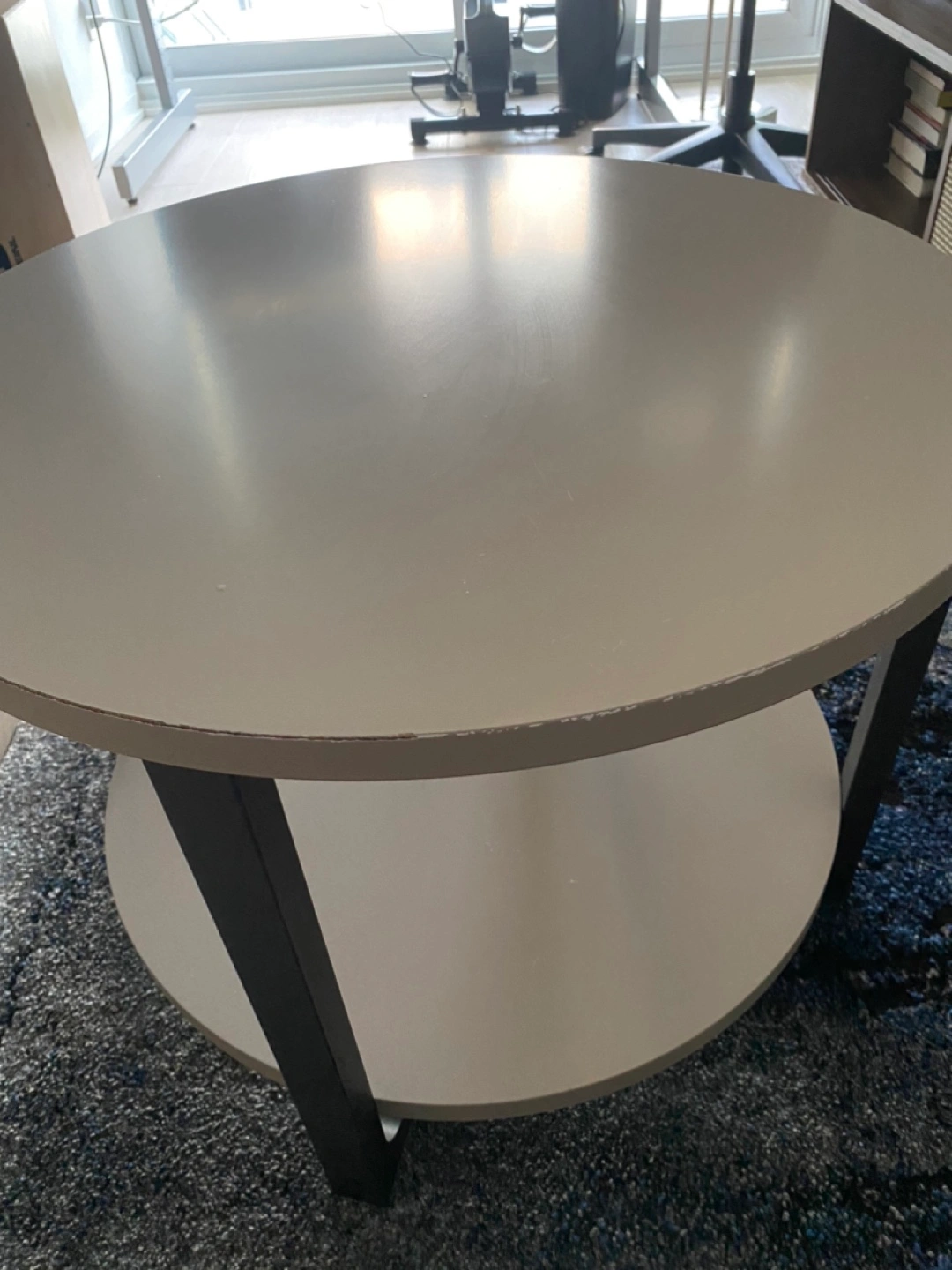 Round coffee table with secondary shelf, black legs, and a light gray top. Minor edge blemishes; otherwise sturdy.