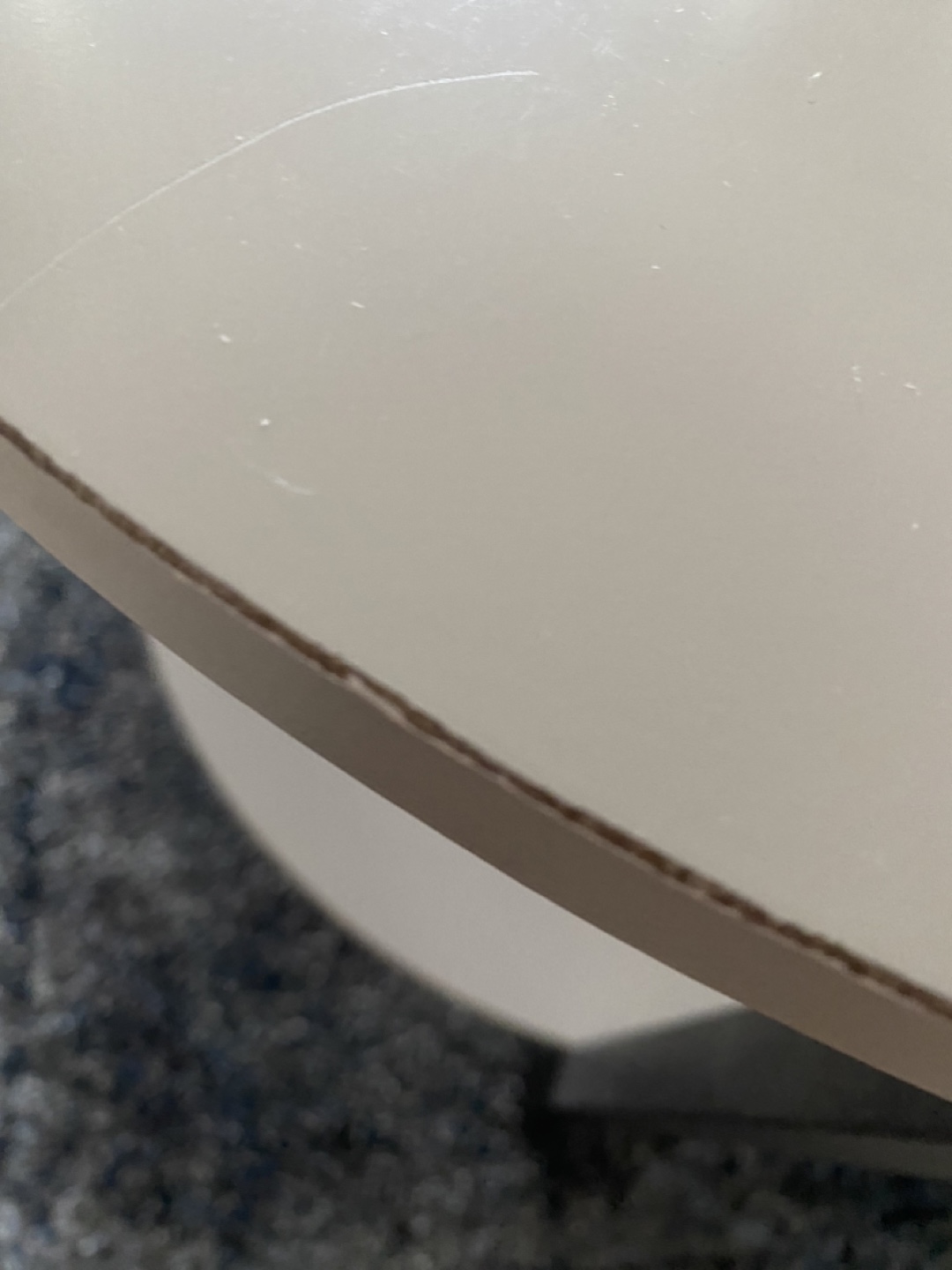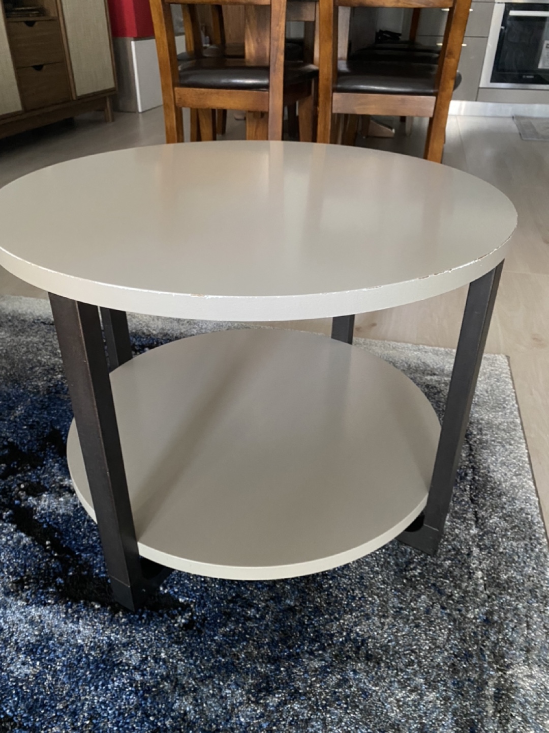 Round coffee table with secondary shelf, black legs, and a light gray top. Minor edge blemishes; otherwise sturdy.