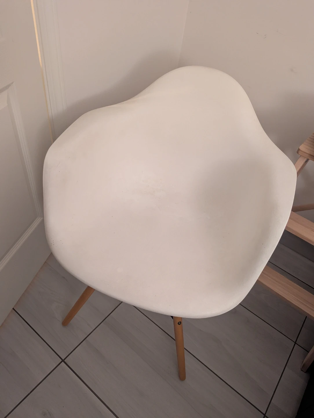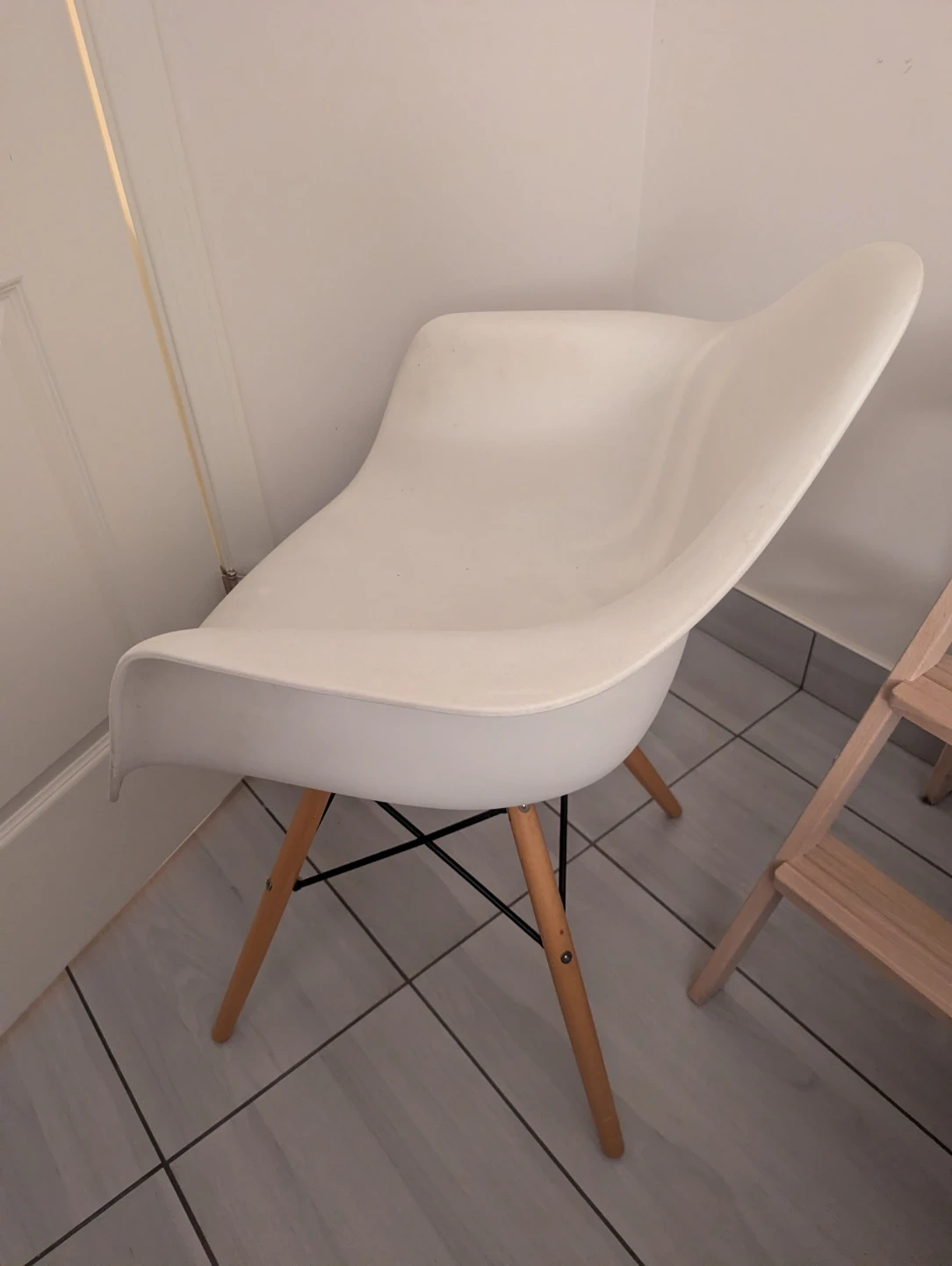 This white chair has a moulded seat and wooden dowel legs with black metal support. It's a classic design that fits many decors. This chair is made of plastic and wood.