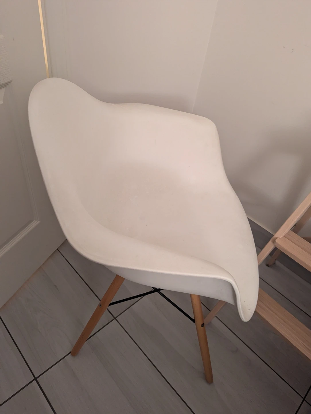 This white chair has a moulded seat and wooden dowel legs with black metal support. It's a classic design that fits many decors. This chair is made of plastic and wood.