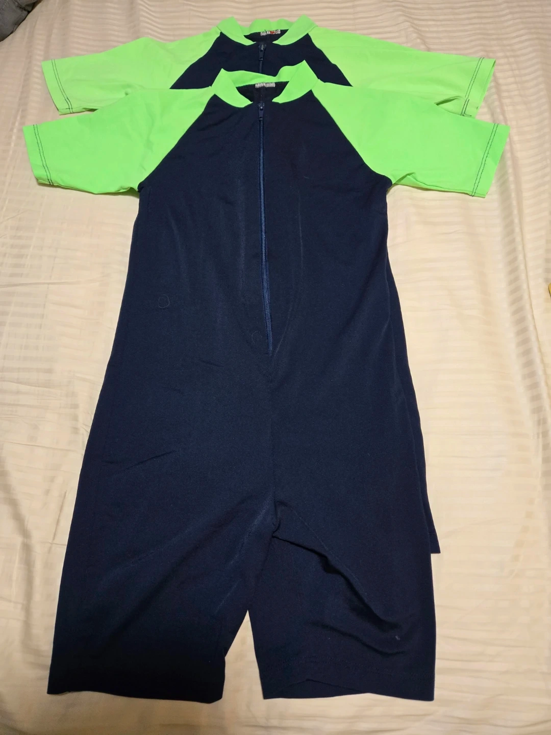 Kids swimsuit, size 8 -10. It's in great shape and ready for some fun in the sun! The swimsuit is navy and bright green.