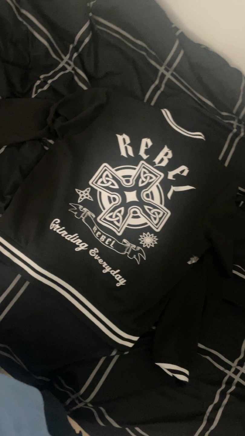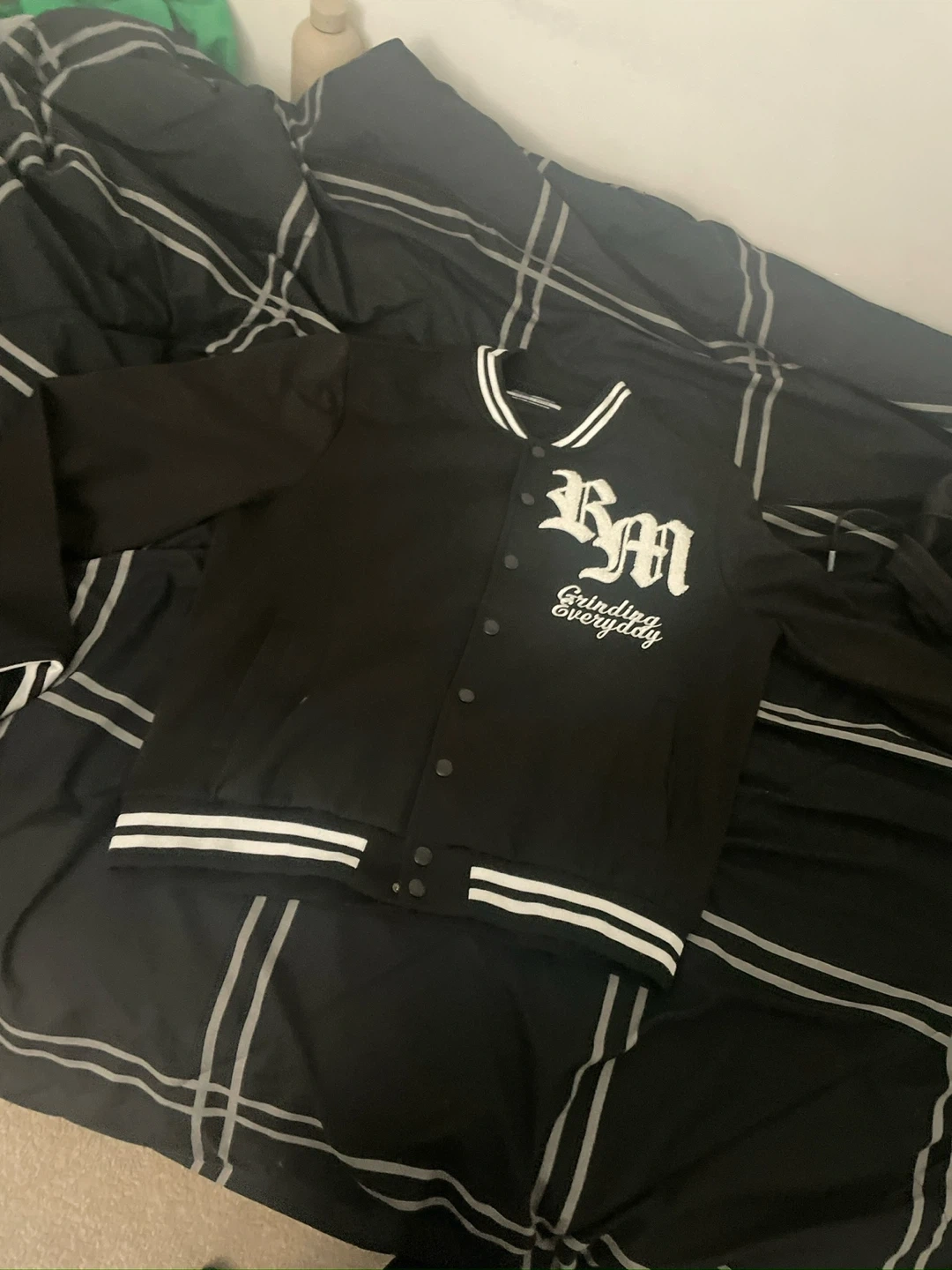 Selling a Rebel Minds varsity jacket in black. It features a unique design on the front and back, with "Grinding Everyday" text. This stylish jacket is perfect for adding a bit of edge to your wardrobe!