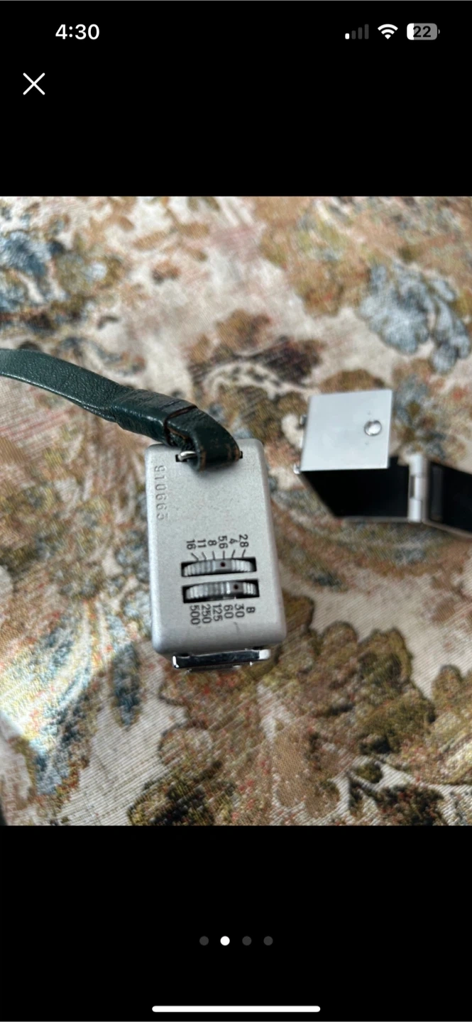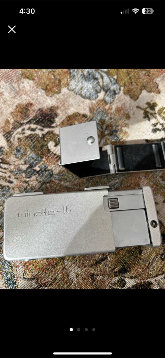 This is a Minolta-16 subminiature camera. It's made of metal and comes with a strap and a combination lock attached. It's a compact camera that uses 16mm film.