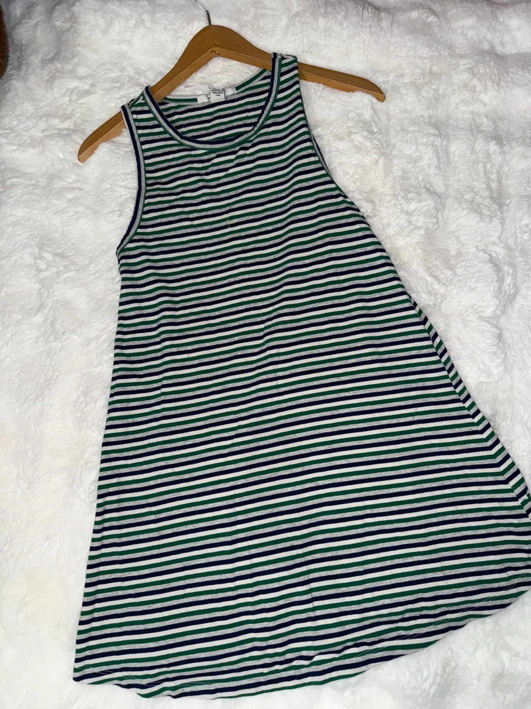 A comfy sleeveless dress featuring a classic green, white, and navy stripe pattern. It's made from a soft, breathable material. This dress is great for casual wear during warmer weather.