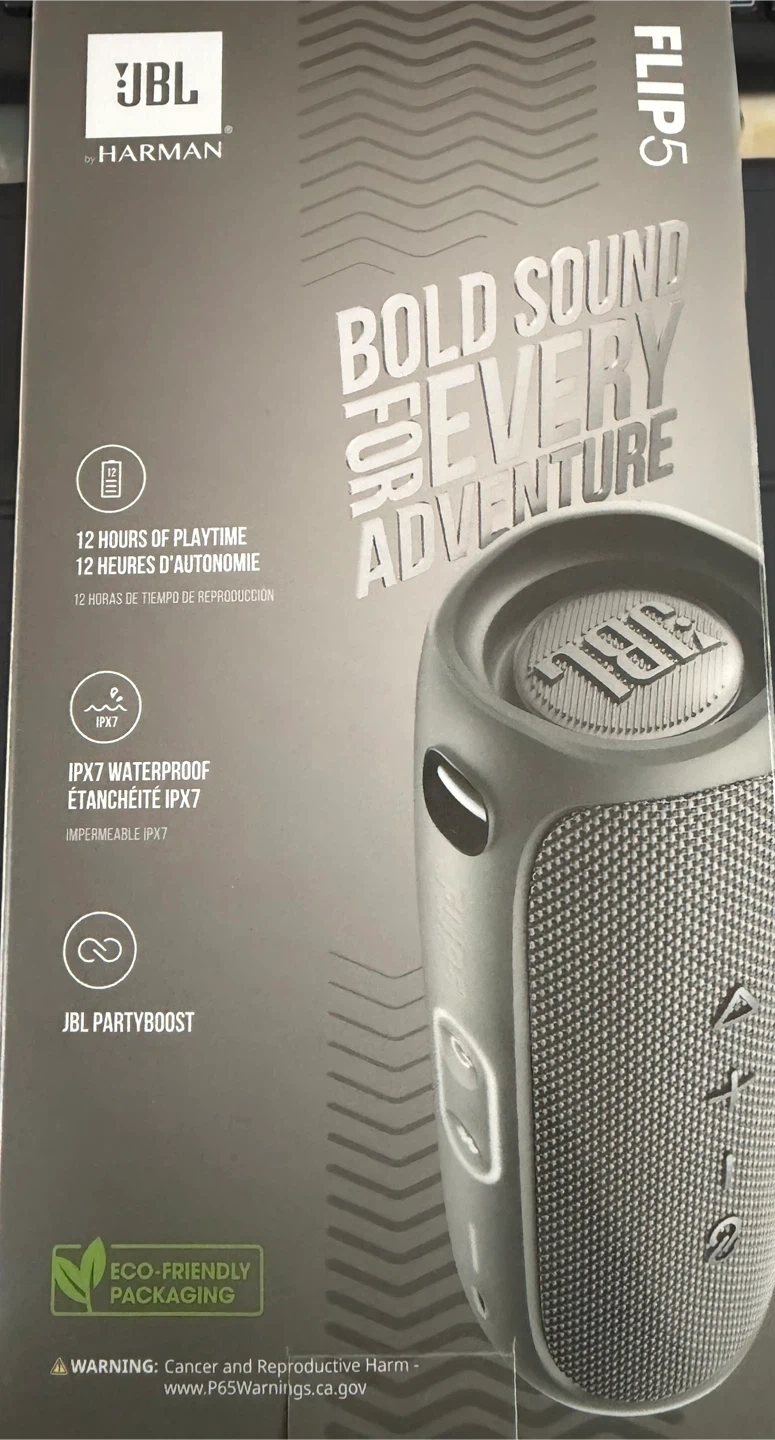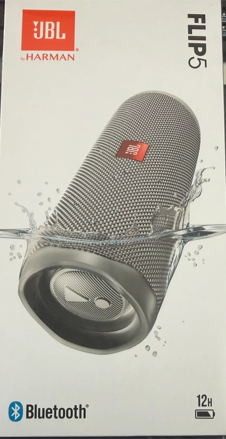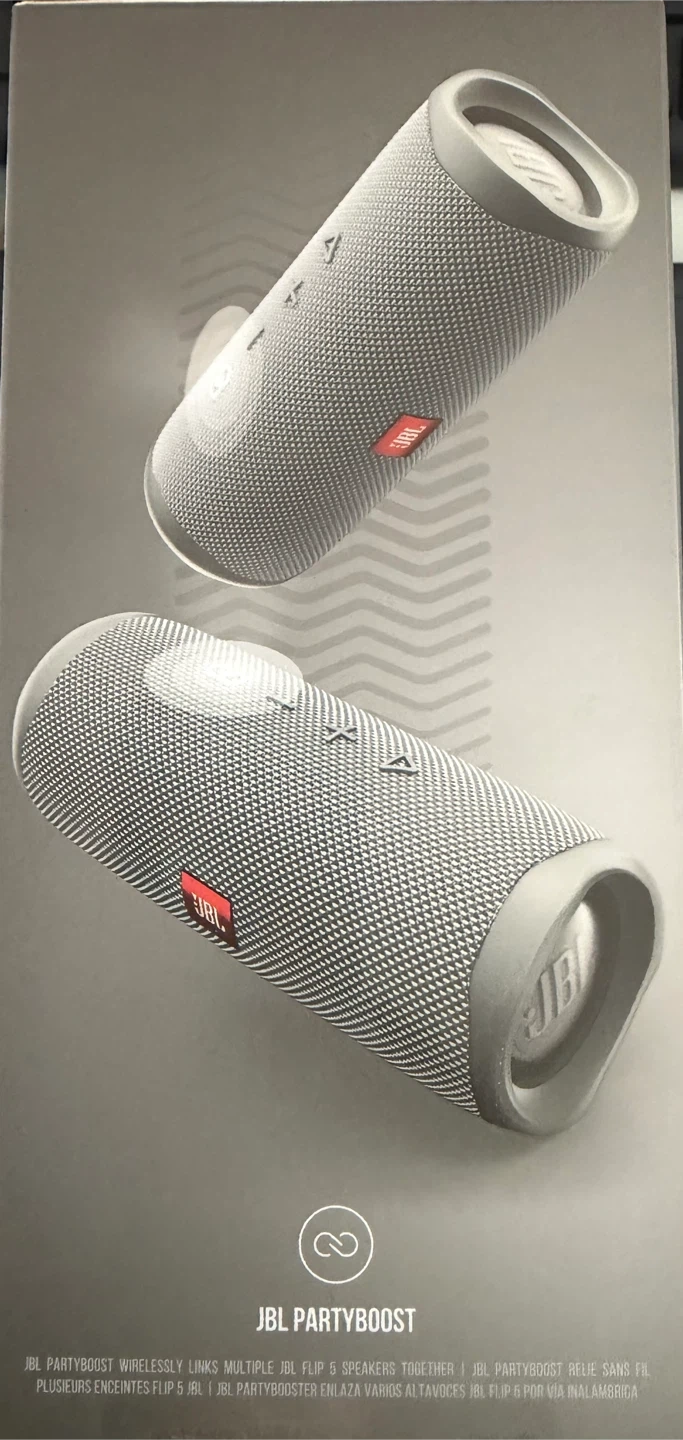 This is a JBL Flip 5 portable Bluetooth speaker BNIB. It offers 12 hours of playtime and is IPX7 waterproof. It also supports JBL PartyBoost to link multiple speakers together.
