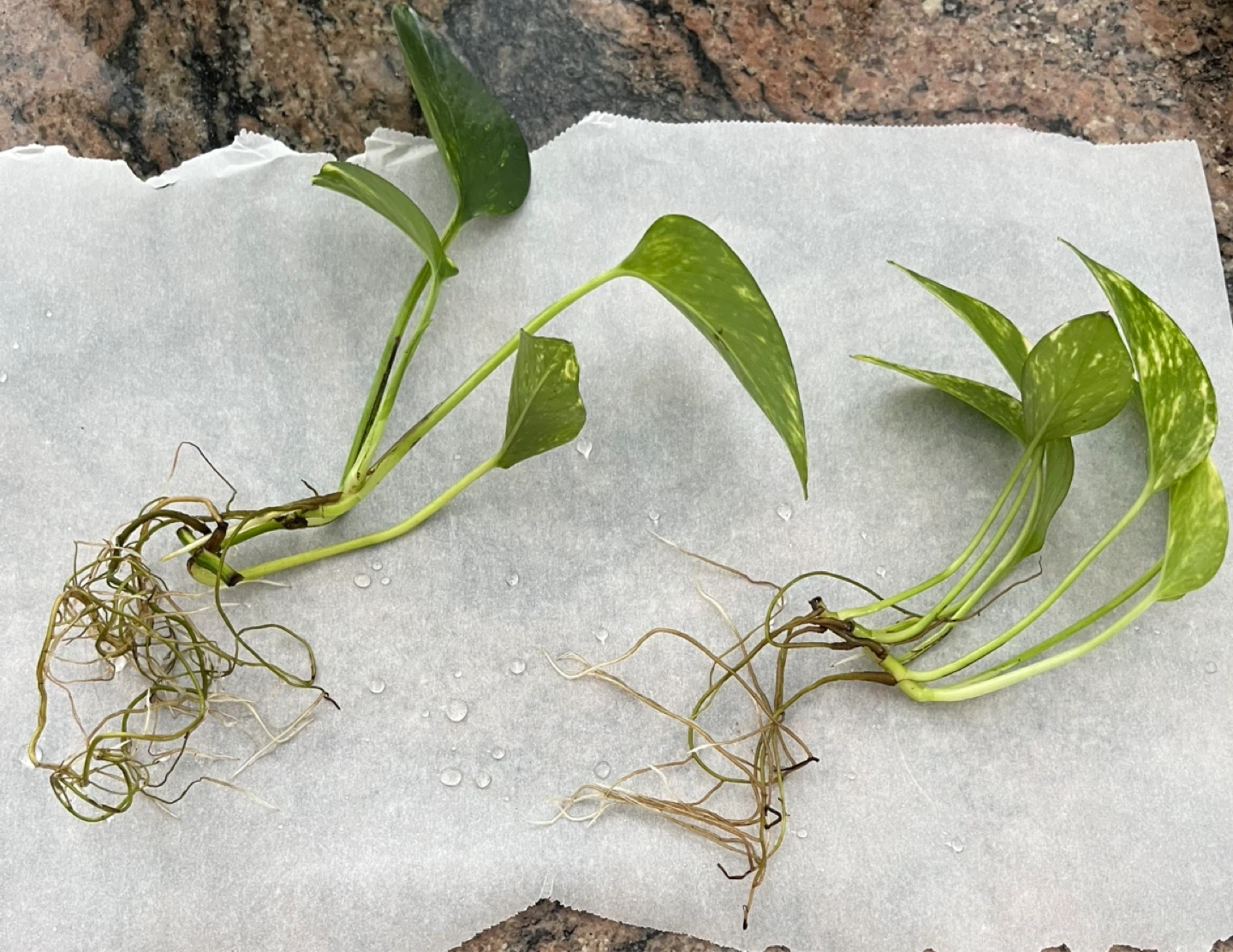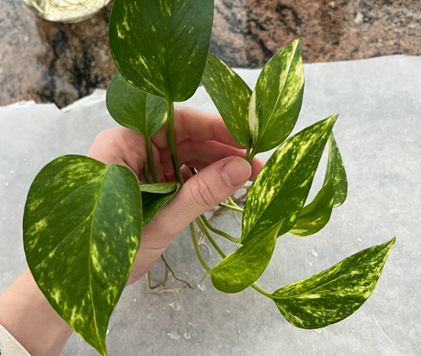 These are healthy pothos plant cuttings with established roots. They're ready to be potted and grown into new plants. The variegated leaves add a lovely touch to any space.