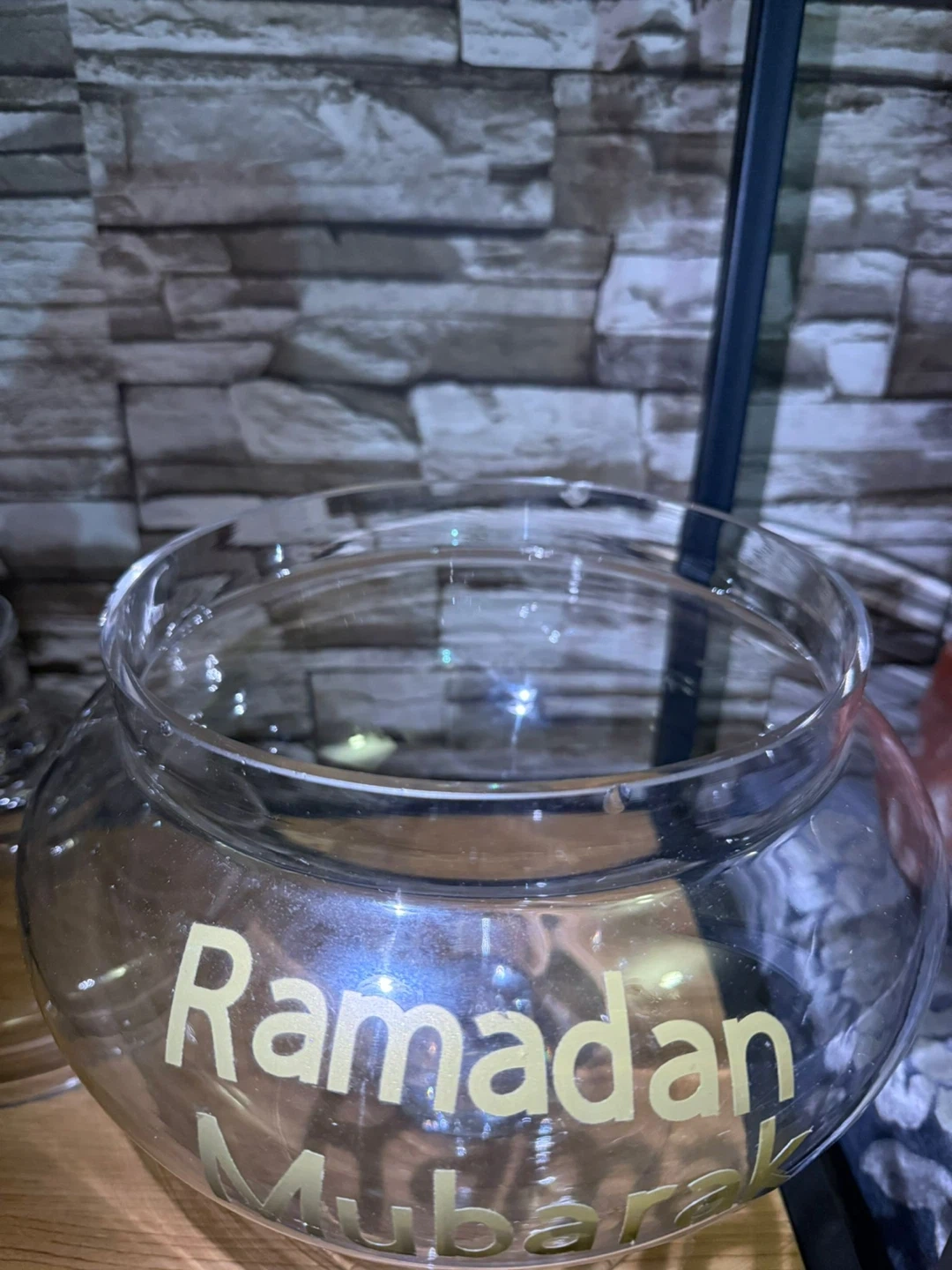 This is a decorative glass jar with "Ramadan Mubarak" printed on it. It includes a matching glass lid. Perfect for holding treats or as a table centrepiece during Ramadan celebrations!