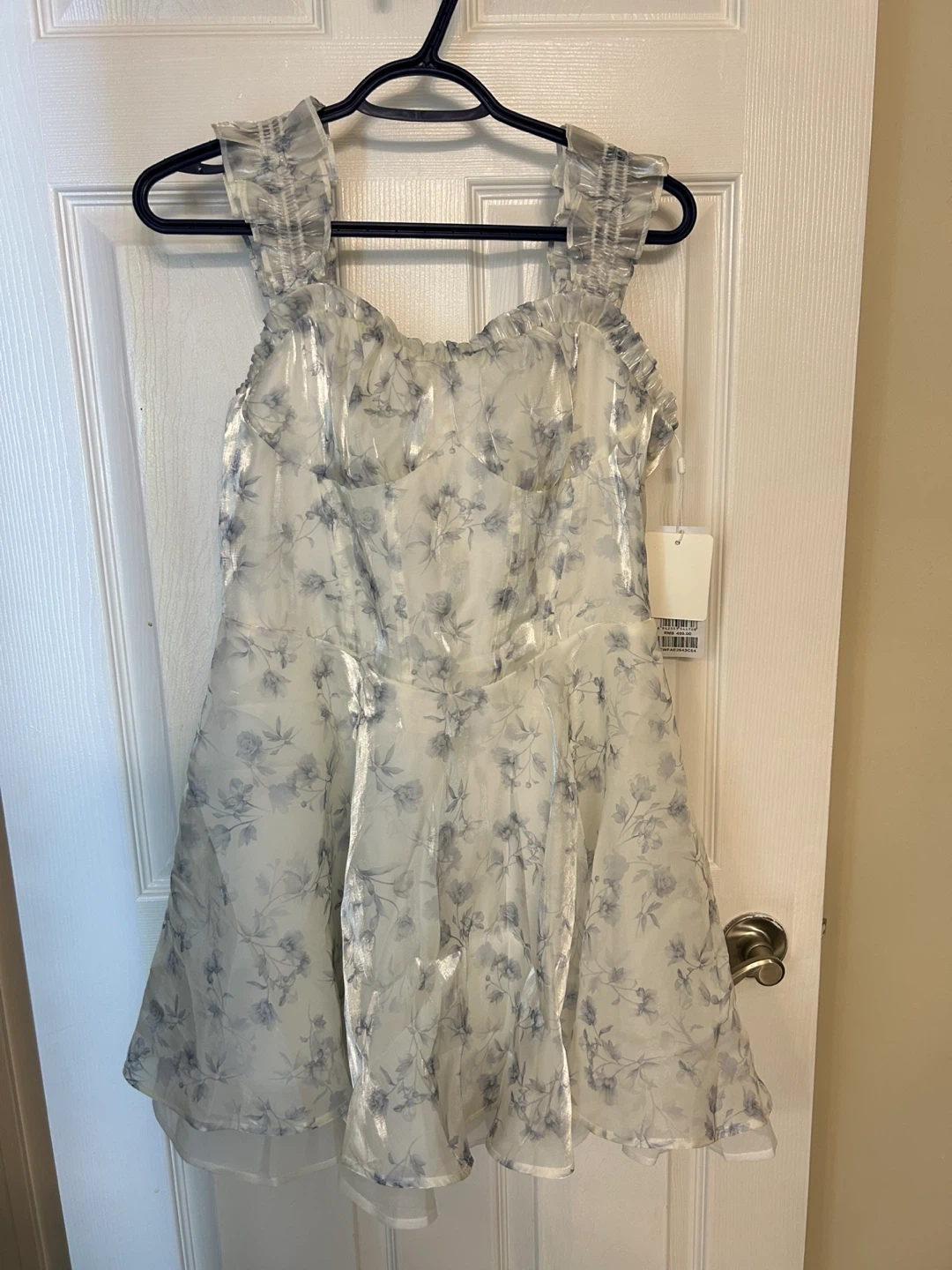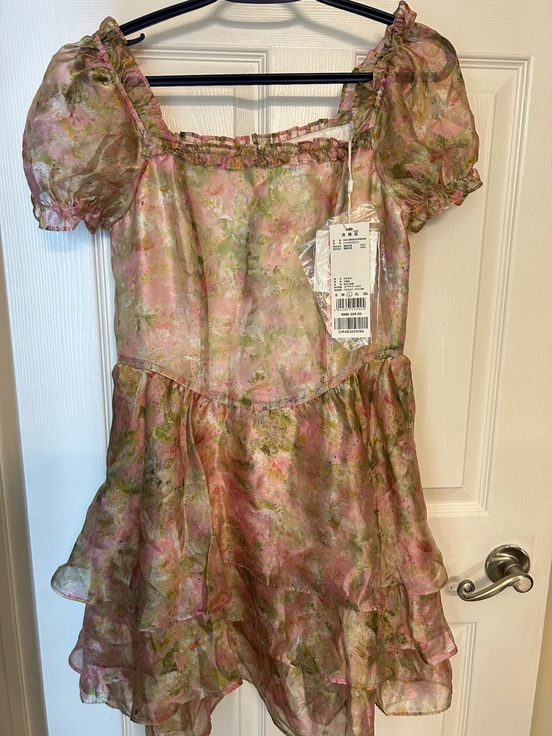 This dress features a romantic floral print with delicate puff sleeves and a ruffled hem. It's made from a lightweight, sheer fabric perfect for warmer weather. The vintage-inspired design makes it a sweet choice for a garden party or casual outing. $15 each, $30 for three of them.