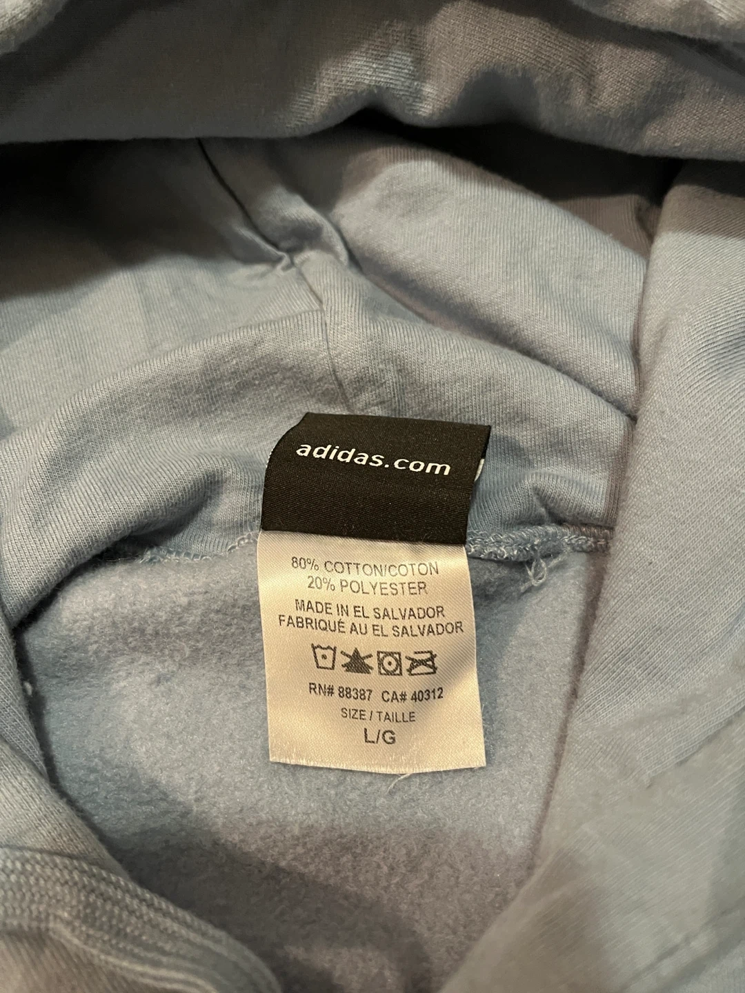 This is an Adidas pullover hoodie in a size large. It's made from 80% cotton and 20% polyester. This hoodie features a kangaroo pocket and an adjustable drawstring hood.