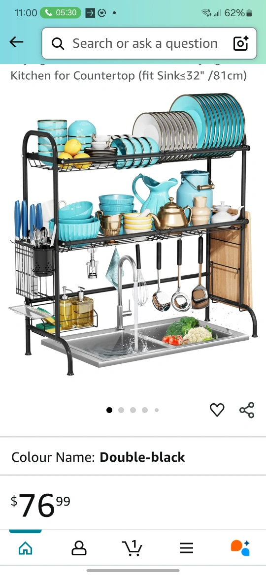 Two-tiered dish drying rack. Durable metal construction. Includes cutlery holder, utensil hooks, and cutting board rack. Fits most double sinks. Measures approximately 86cm wide.