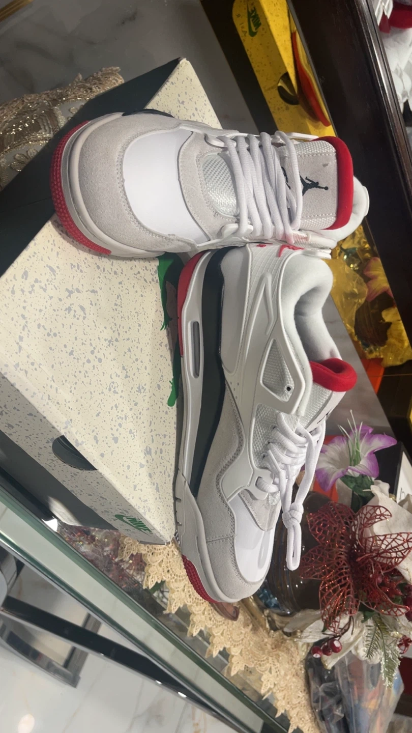 Air Jordan 4 Fire Red (2020) 🔥 White, red, and gray Jordan 4 "White Cement" sneakers. Includes original box. Leather and suede materials. Lace-up closure. Size 9