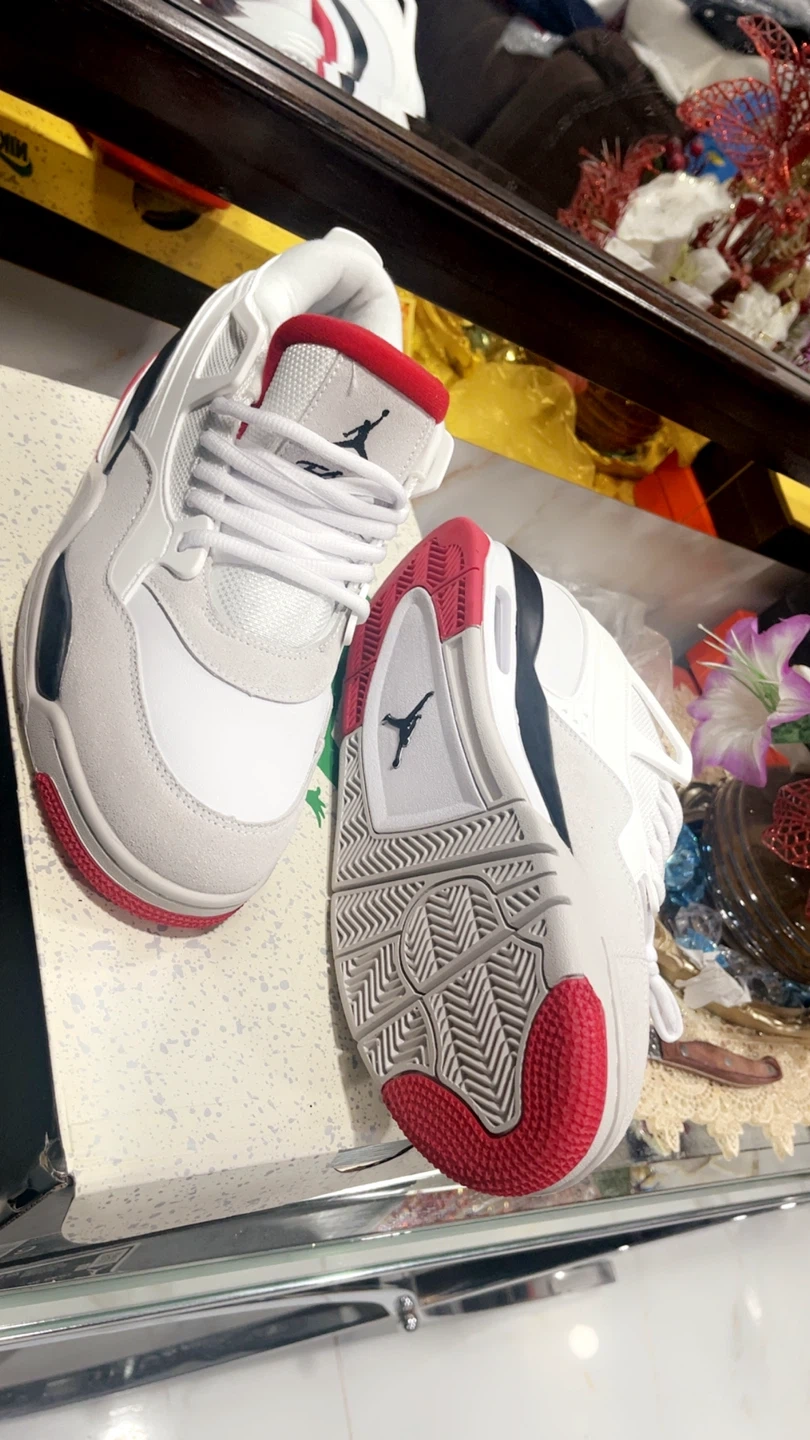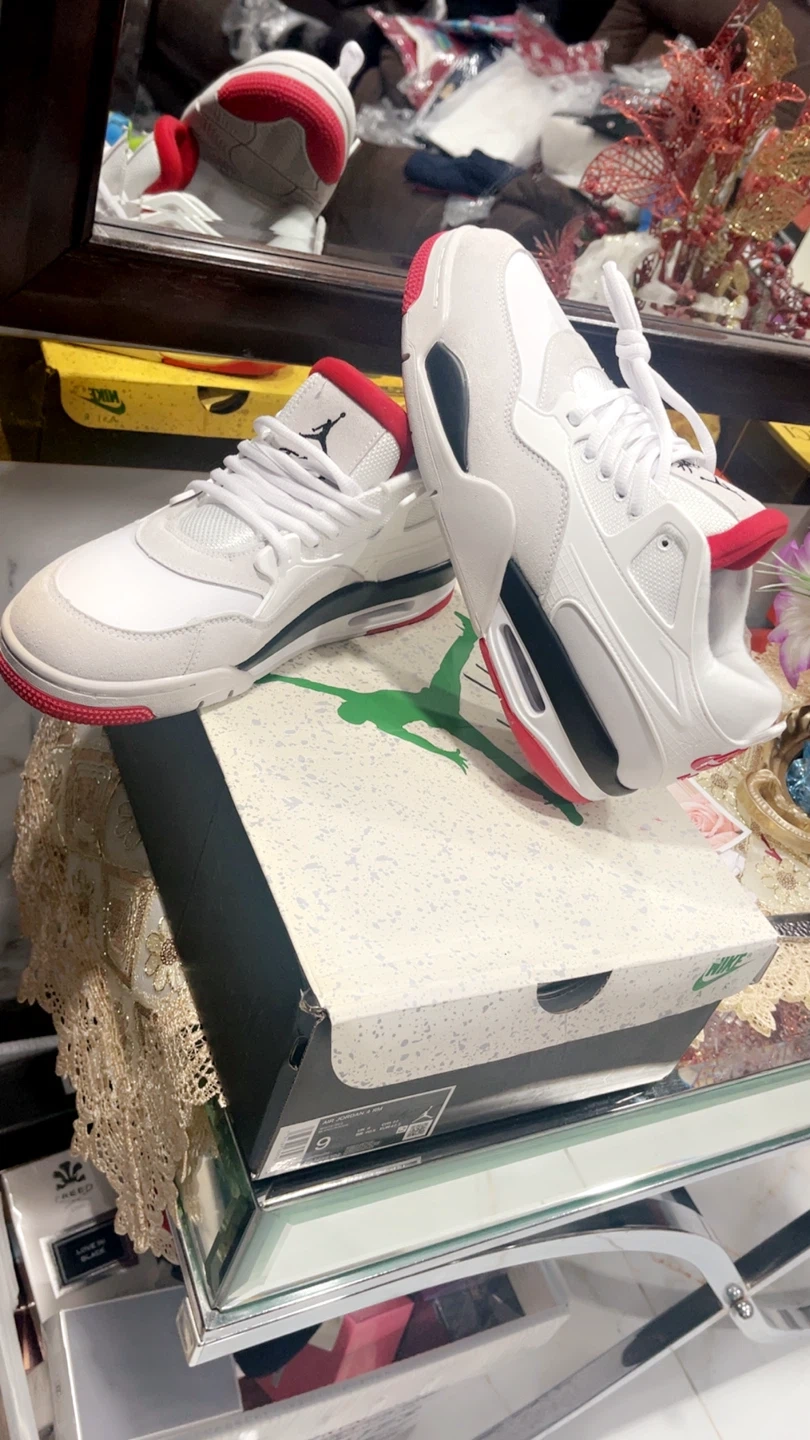 Air Jordan 4 Fire Red (2020) 🔥 White, red, and gray Jordan 4 "White Cement" sneakers. Includes original box. Leather and suede materials. Lace-up closure. Size 9