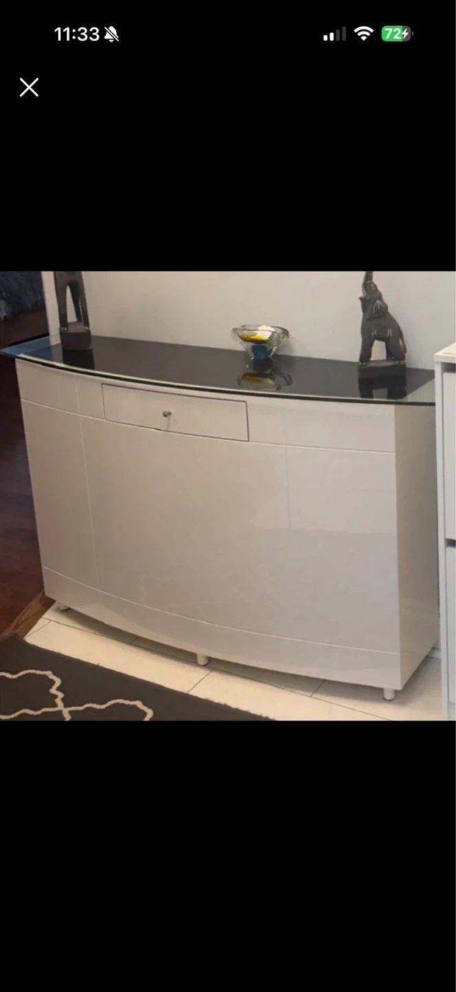 This is a sleek white sideboard with a curved front. It features a smooth black glass top and a single drawer with a silver handle. Its clean lines make it a stylish addition to any room