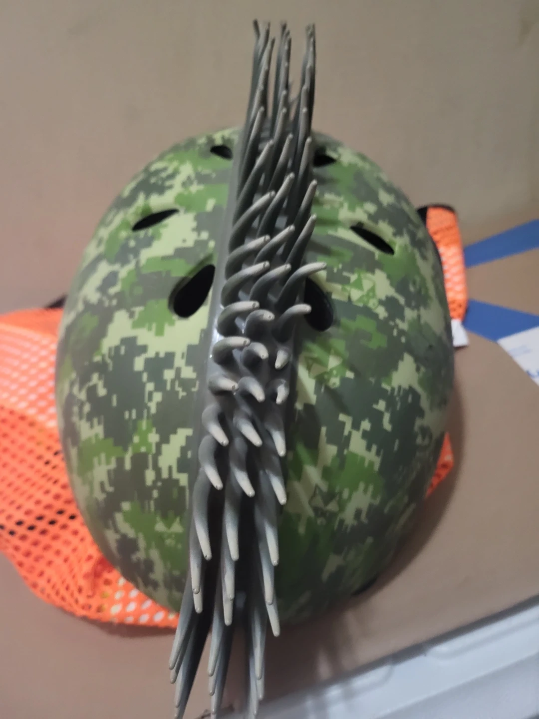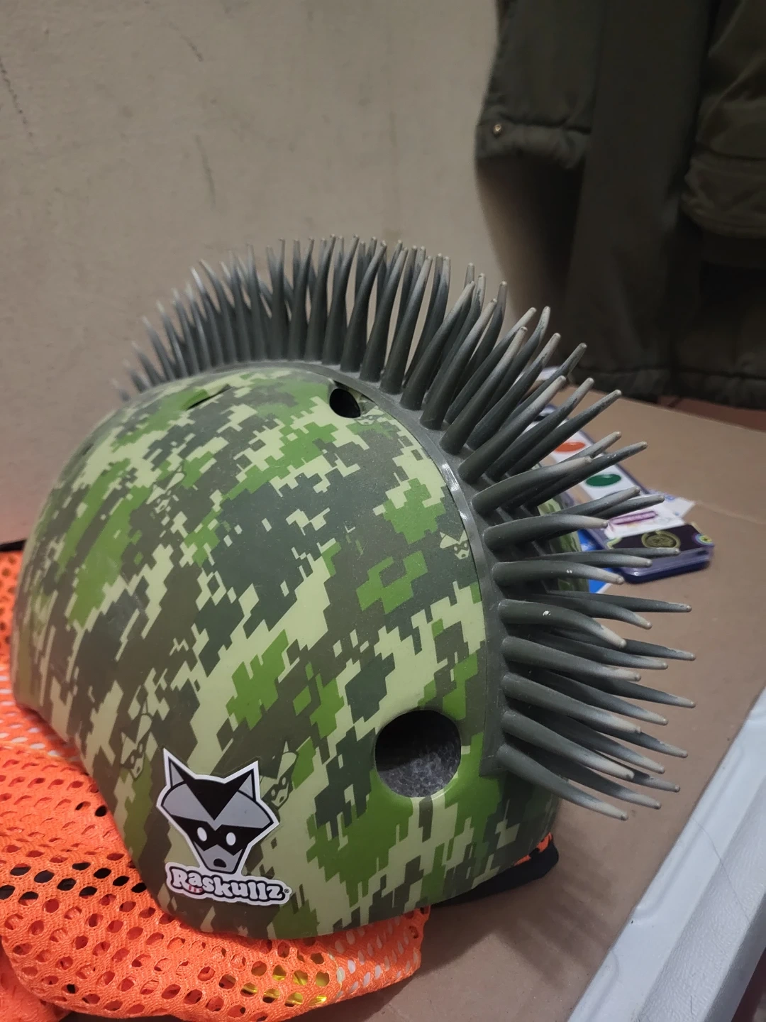 Selling a Raskullz child's helmet in size small. It's in good condition and ready for a new owner! Perfect for biking, skating, or scootering. The helmet features a cool camouflage design and a unique mohawk style.
