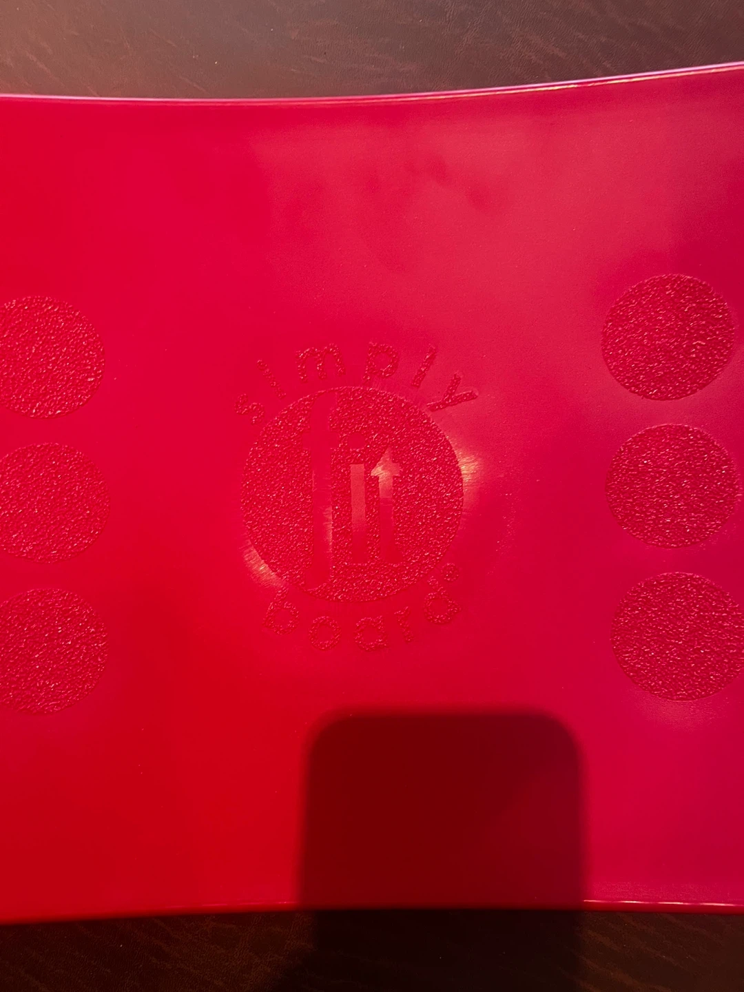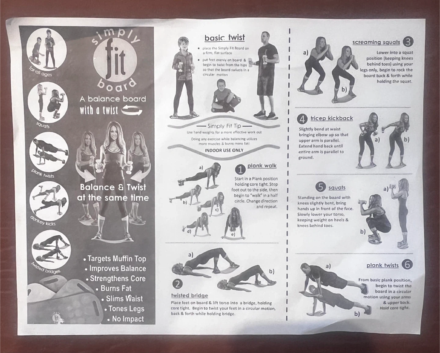 This is a red Simply Fit Board balance board. It's designed for balance and core workouts. It's great for targeting muffin tops and strengthening your core! Comes with instructions.