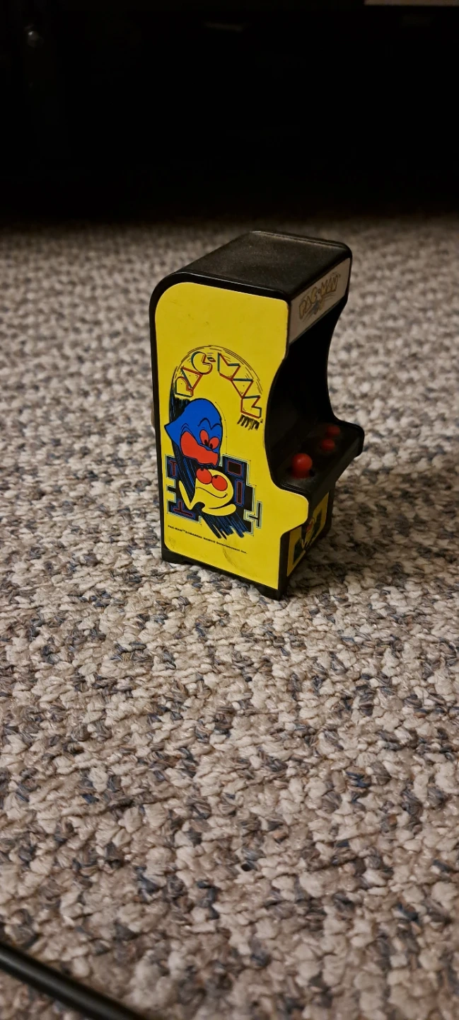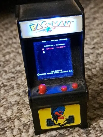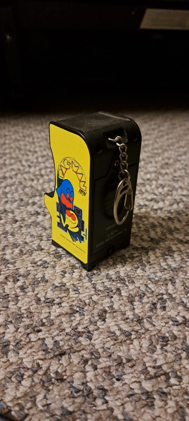 This is a miniature Pac-Man arcade game keychain. It features classic Pac-Man graphics and a working screen. The unit includes a metal keychain attachment.