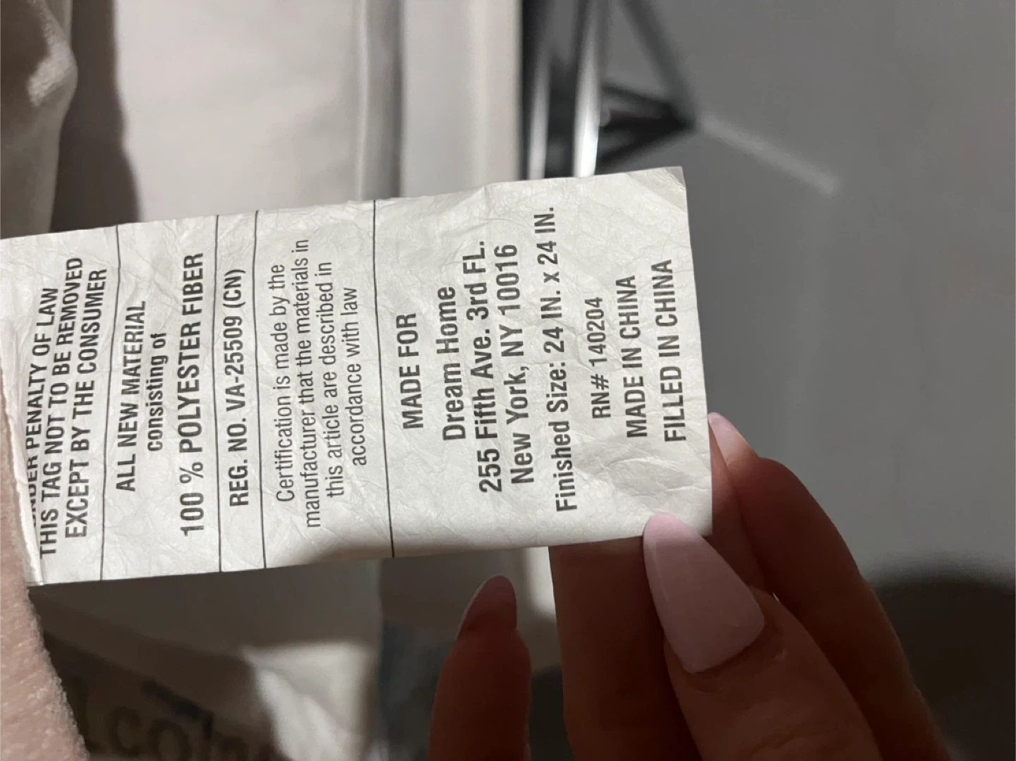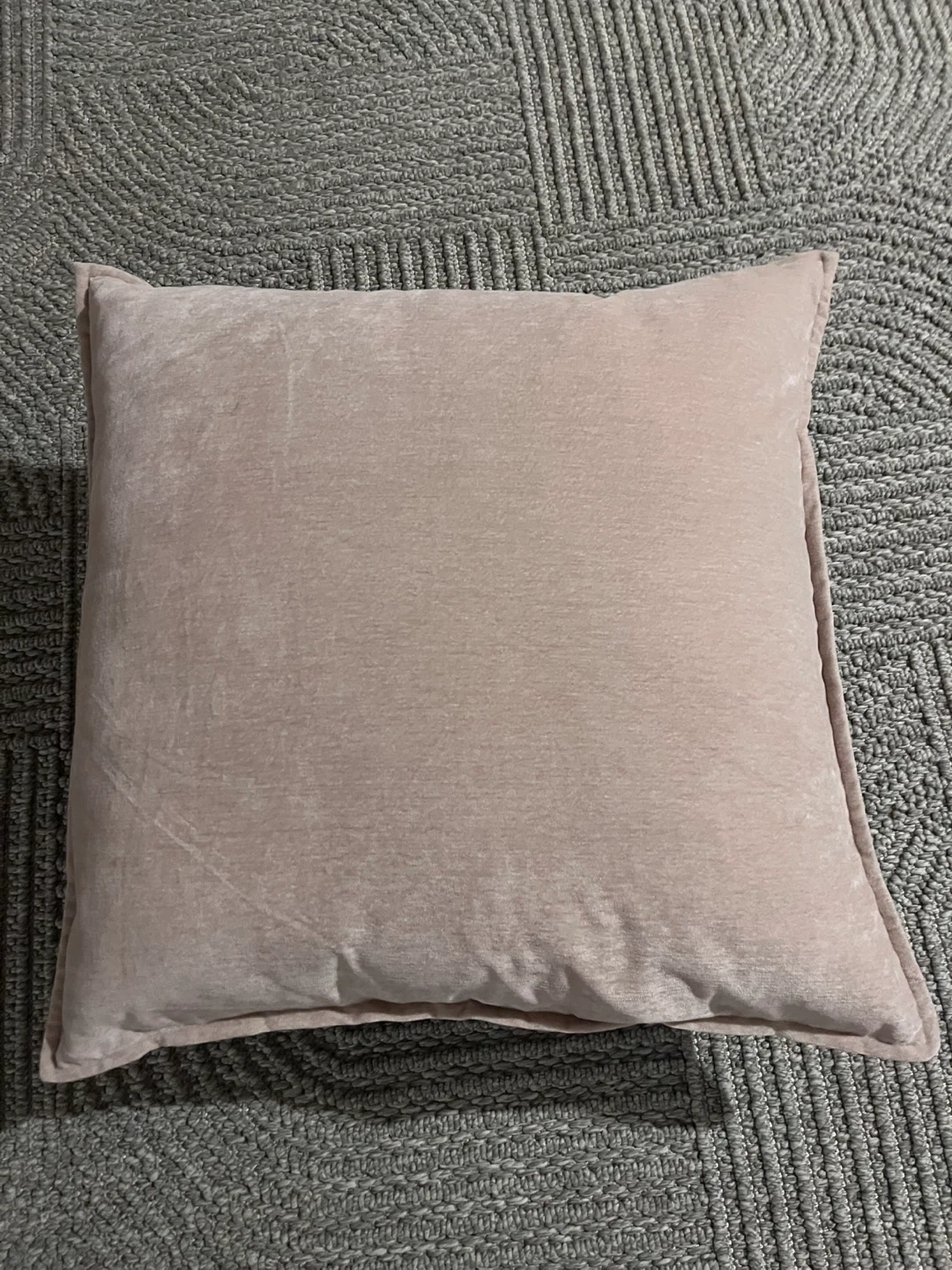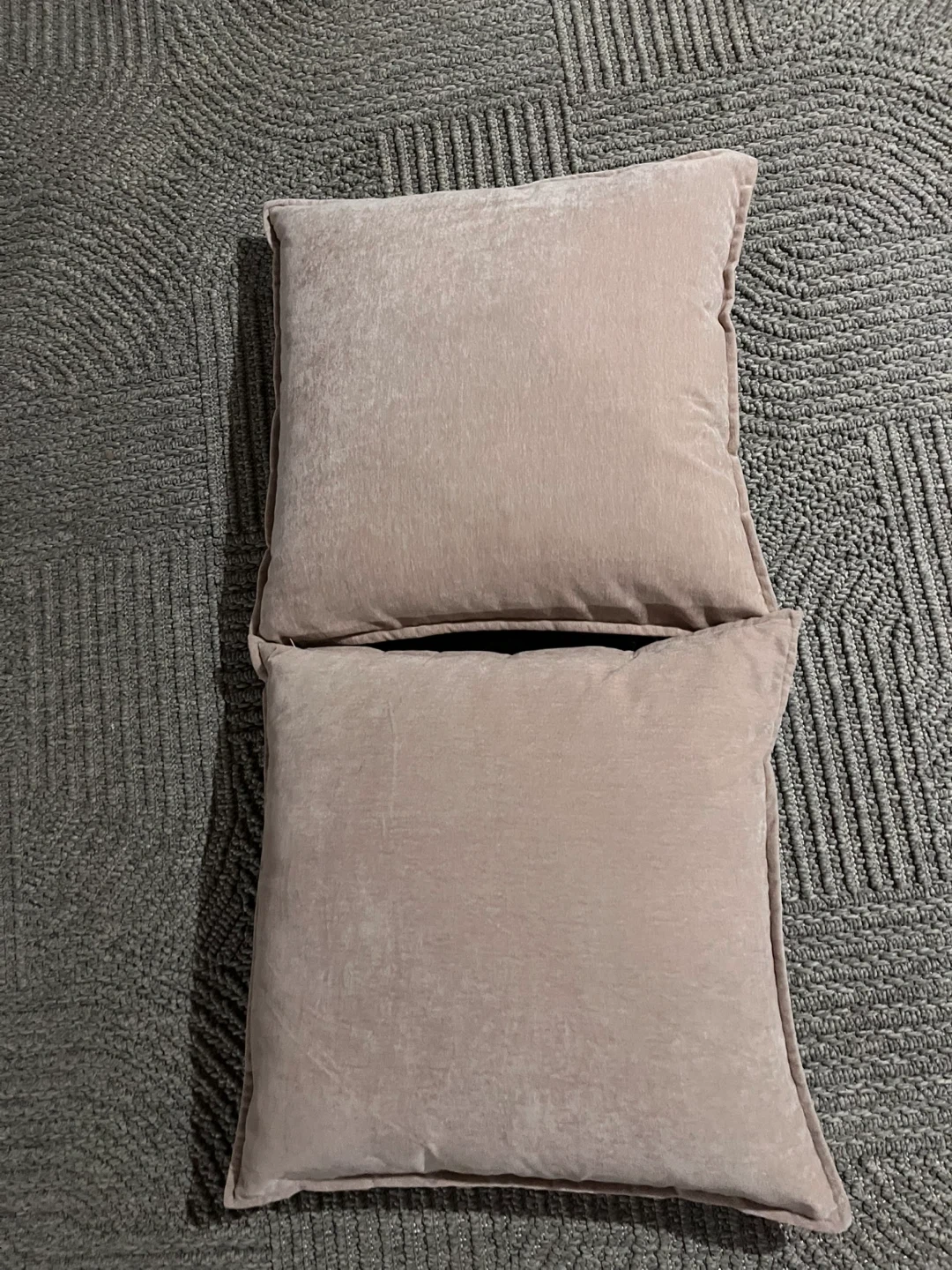 This is a set of two blush pink throw pillows. They are made with 100% polyester fiber. The finished size is 24 inches by 24 inches.