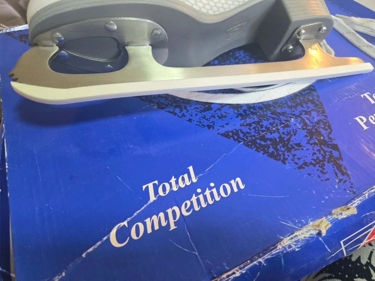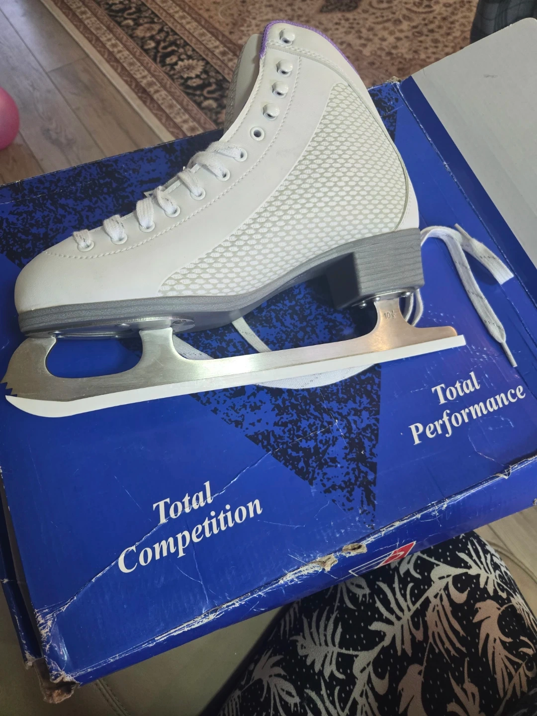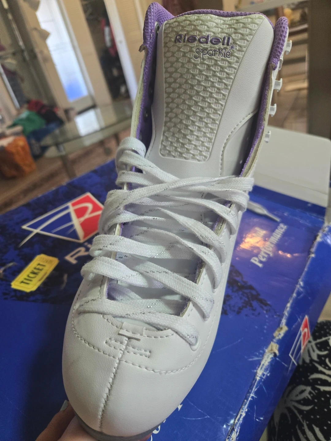 These Riedell Sparkle figure skates are white with purple accents and laces. They include a supportive boot and durable blades. Perfect π and BRAND NEW π