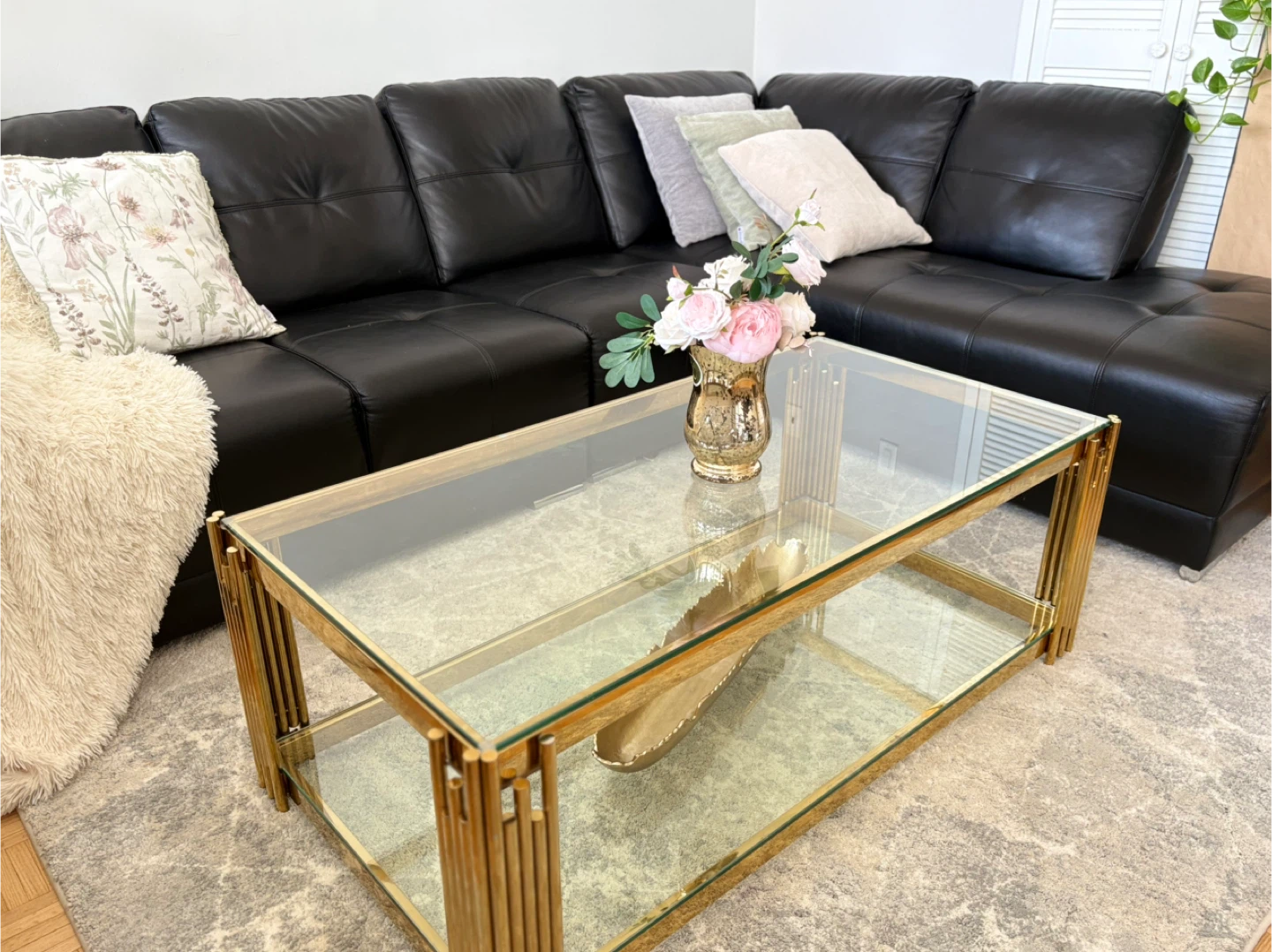 This stylish coffee table features a sleek unbroken glass top and a gold-toned frame with unique vertical supports. It includes a lower shelf unbroken glass for extra storage. It's perfect for adding a touch of modern elegance to your living room!