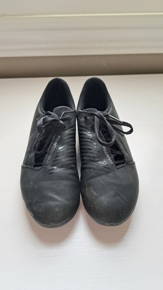 Selling a pair of Nike Phantom VNX soccer cleats in black. They're in used condition, as you can see in the photos. Still lots of life left in them for the field! Size 4Y.
