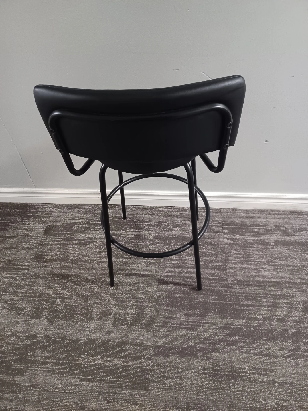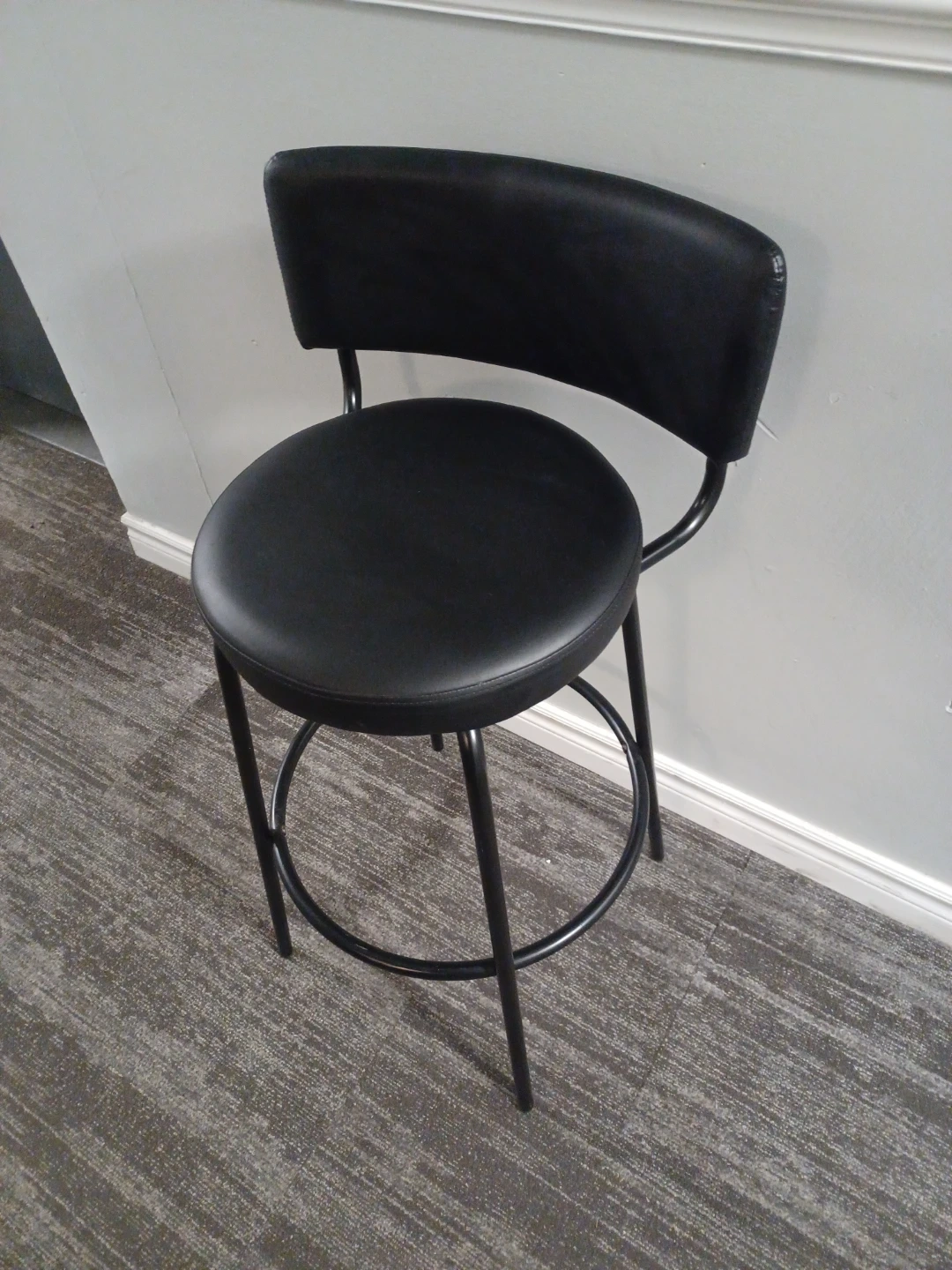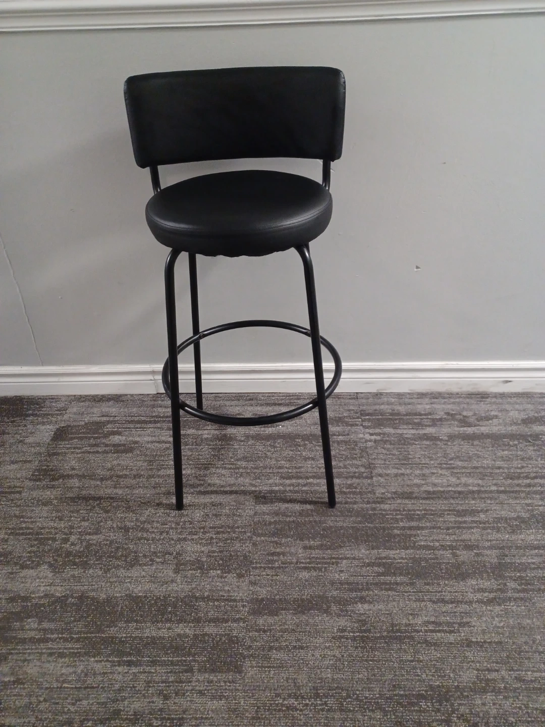 This bar stool is upholstered in black faux leather with a supportive backrest and a foot ring. It's built with a sturdy metal frame. This stool's a good fit for a home bar or kitchen island.