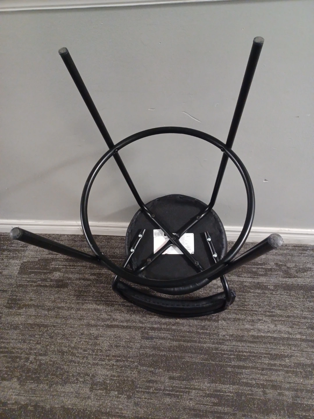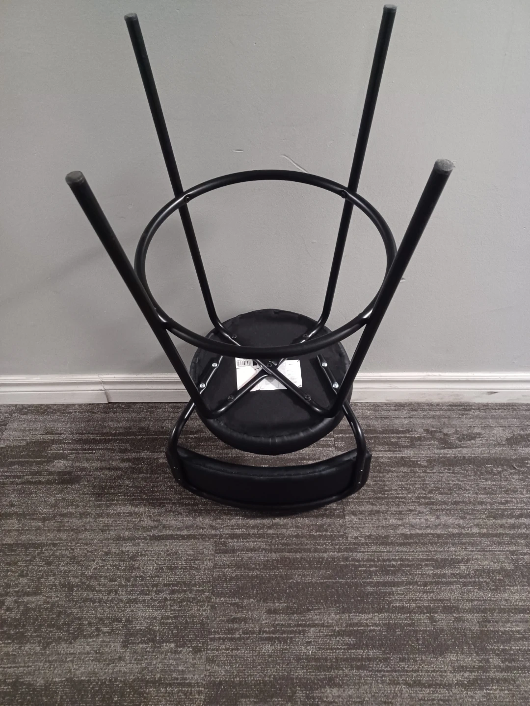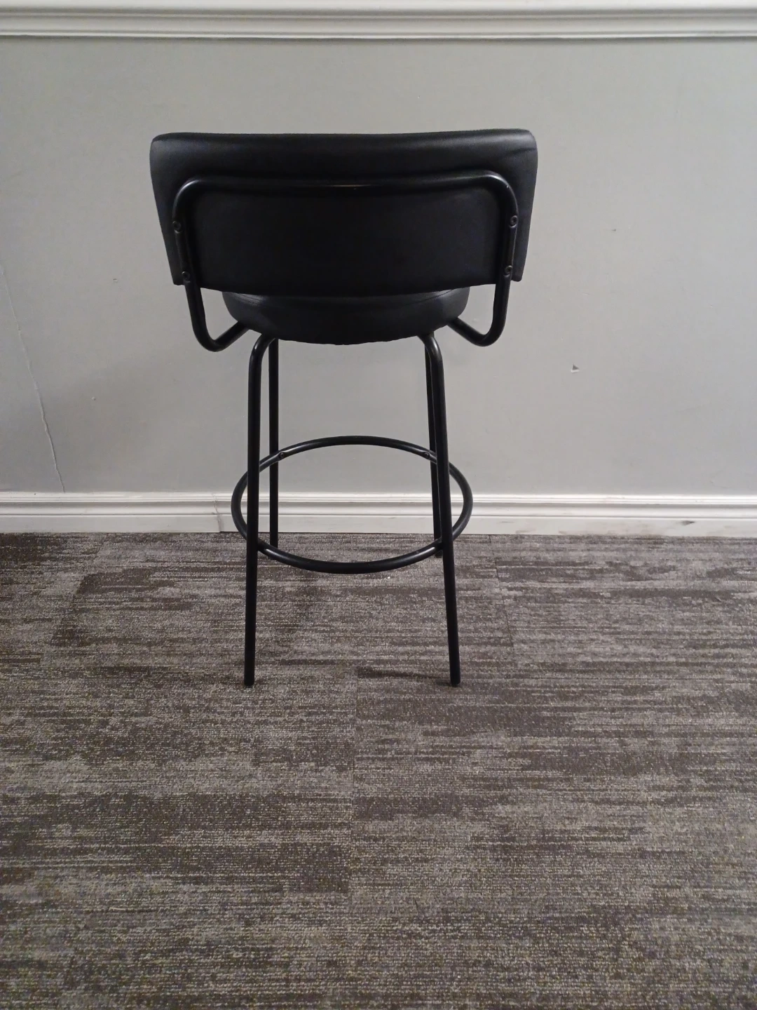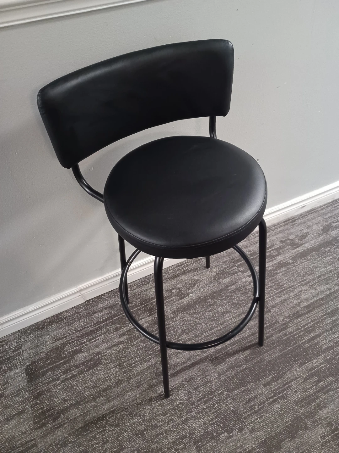 This bar stool is upholstered in black faux leather with a supportive backrest and a foot ring. It's built with a sturdy metal frame. This stool's a good fit for a home bar or kitchen island.
