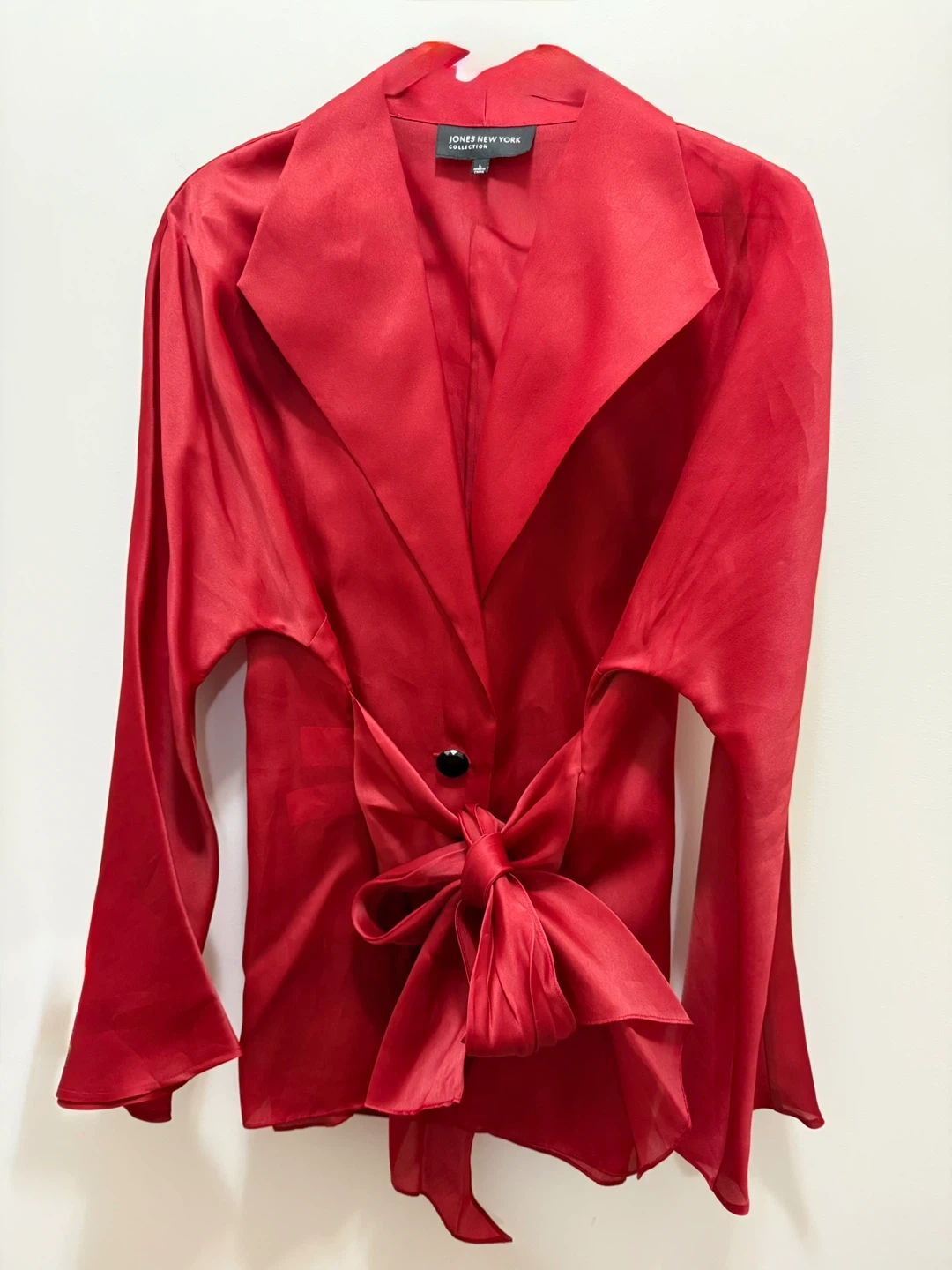 This beautiful Jones New York Collection silk blouse is a vibrant RED β€οΈ It features a stylish tie-front or back bow detail and wide bell sleeves. A very classy and elegant red blouse β€οΈβ€οΈβ€οΈ