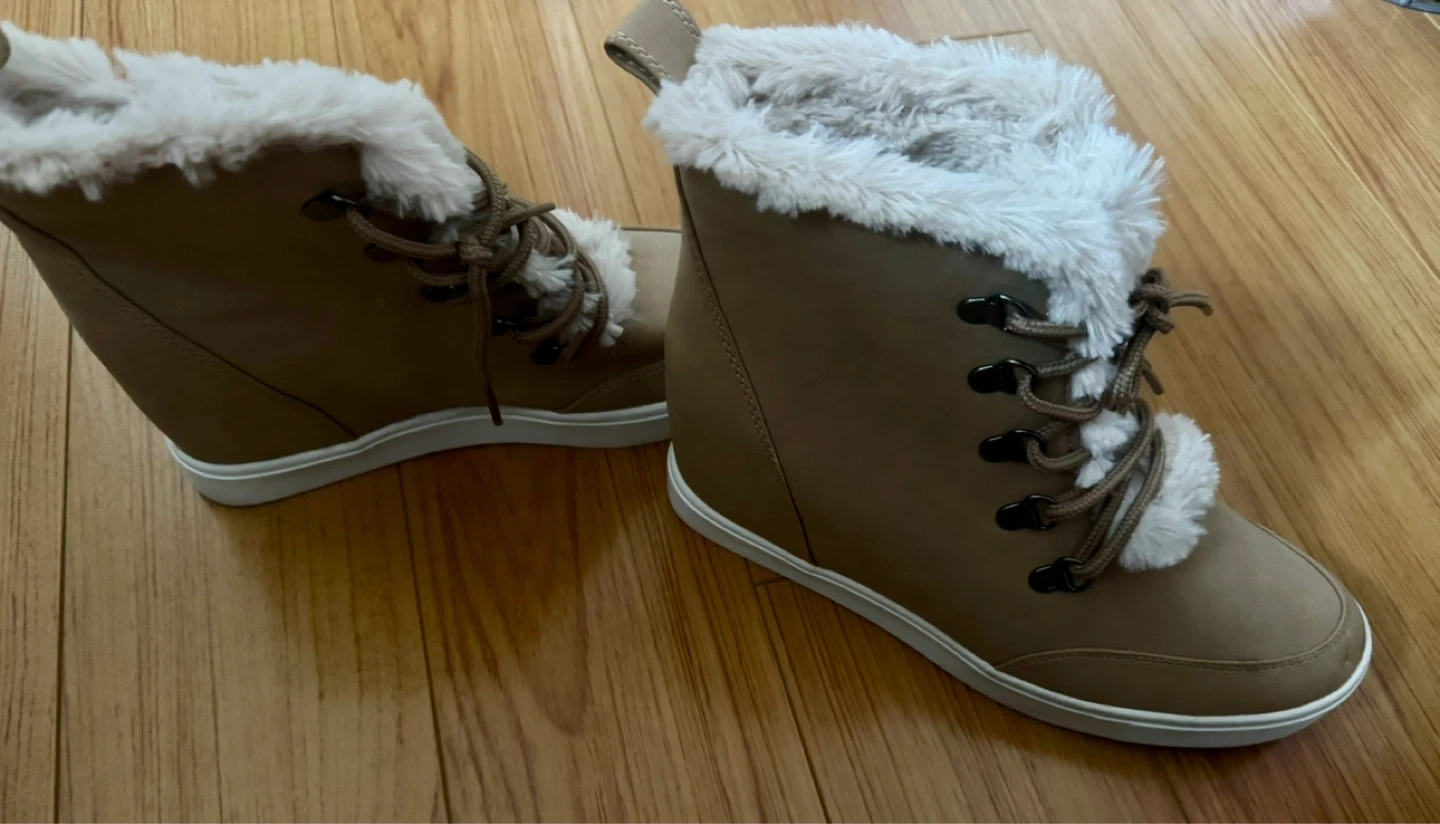 Warm tan wedge boots with faux fur lining for added comfort and style. They feature a lace-up front for a secure fit. These boots are designed for a cozy feel.