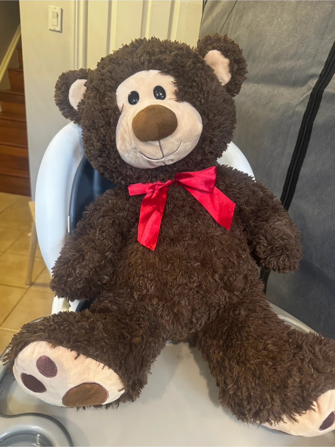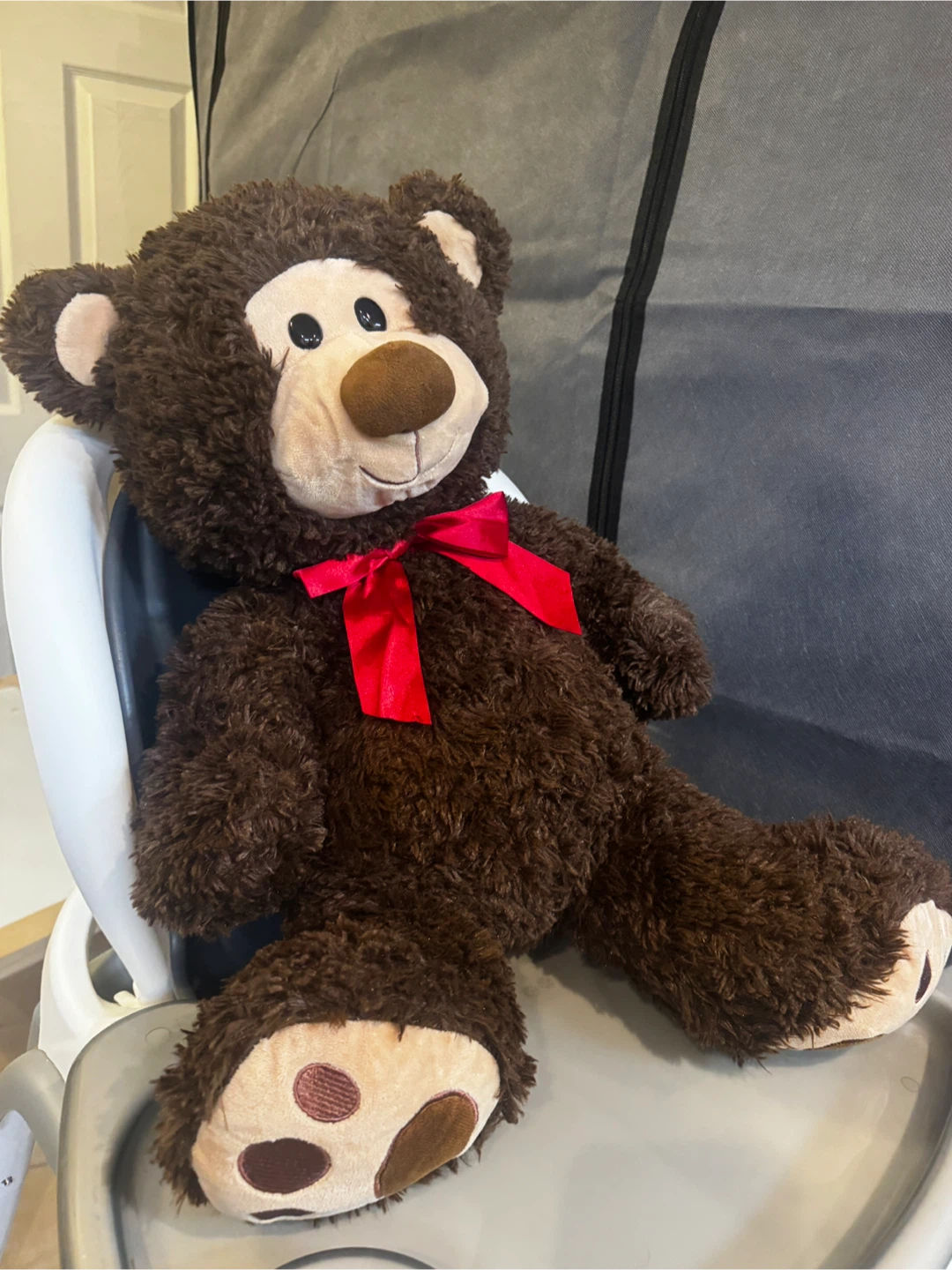 A cuddly brown teddy bear is looking for a new home! It has a cute red ribbon around its neck and is in great condition. Perfect for a child's room or as a comforting friend