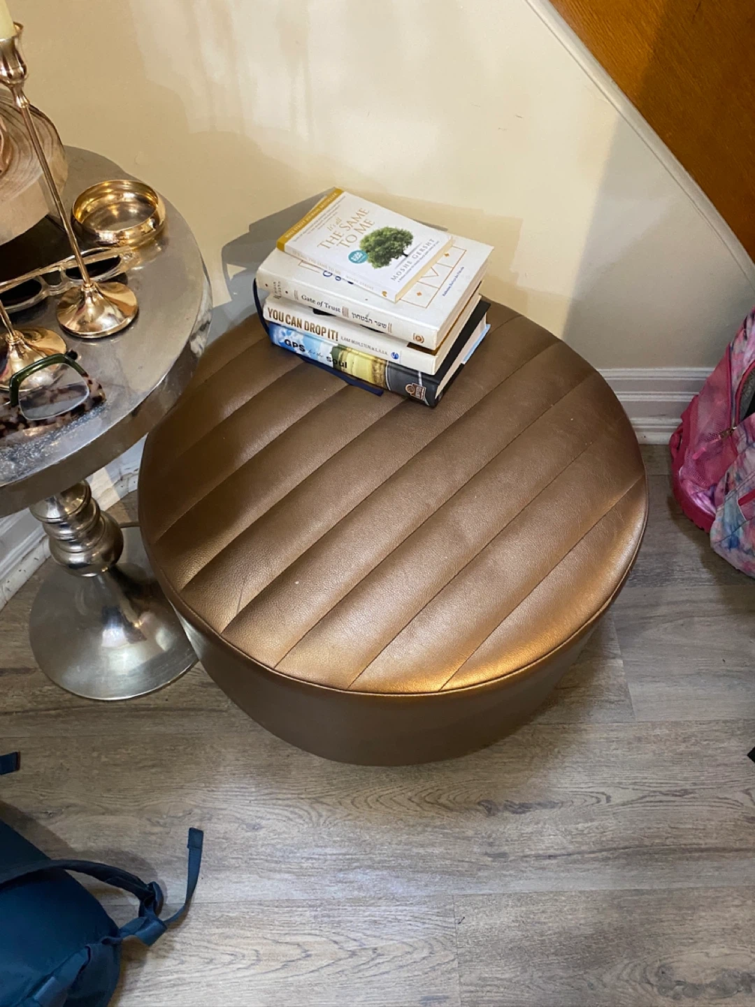A stylish round ottoman with a bronze, tufted upholstered top. It's perfect for adding extra seating or as a footrest. Its compact size makes it versatile for various rooms.